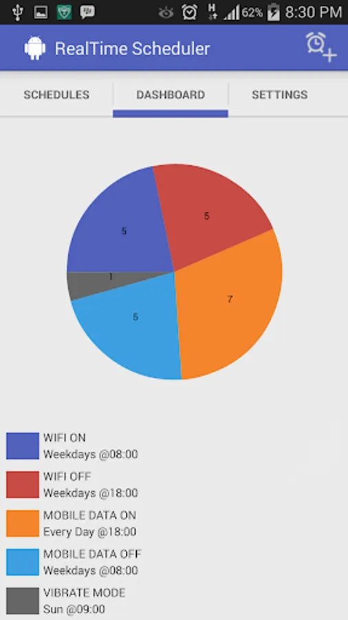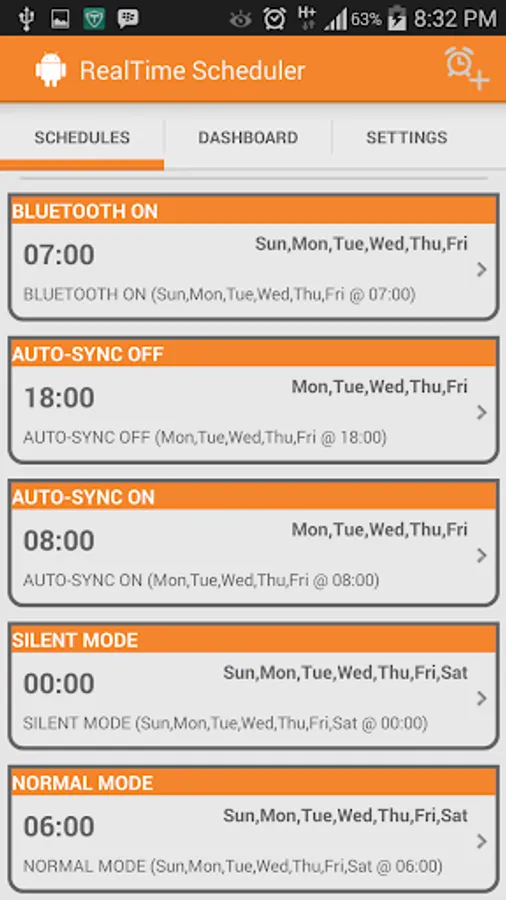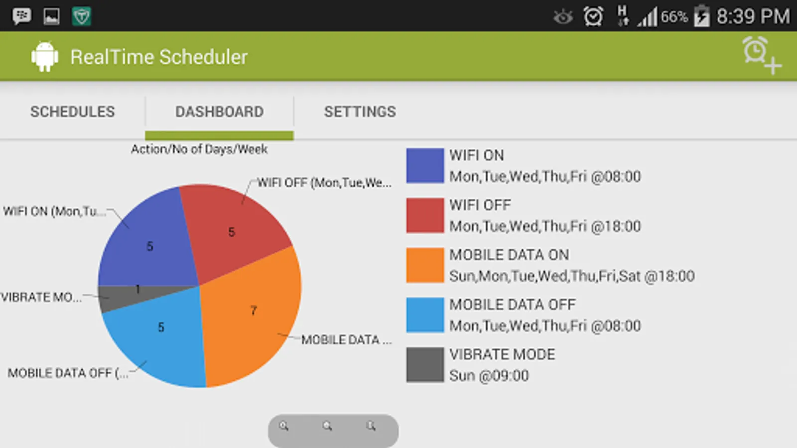 With RealTime Scheduler you can have unlimited schedule of actions to turn on and off WiFi, Bluetooth, Mobile Data, AutoSync,Silent Mode,Vibrate Mode,Normal(Loud) Mode at any specific time of the day repeatedly.