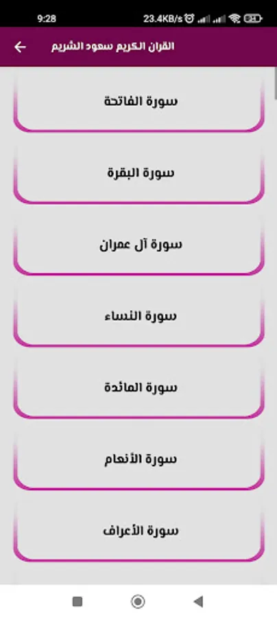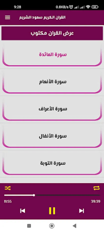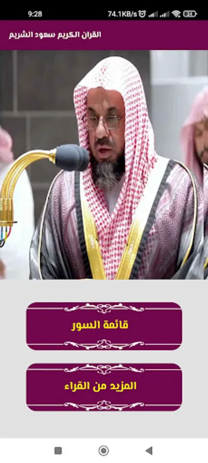 The application of the Noble Qur’an provides the voice of Saud Al-Shuraim. Hear all the surahs of the Holy Qur’an through your mobile phone or tablet with ease and ease through one program that contains all the surahs of the Holy Qur’an. The Quran recitation application is characterized by the voice of Saud Al-Shuraim by being free and available on the store for Android phones. In order to enjoy reciting the Noble Qur’an with the voice of Sheikh Saud Al-Shuraim wherever you want.