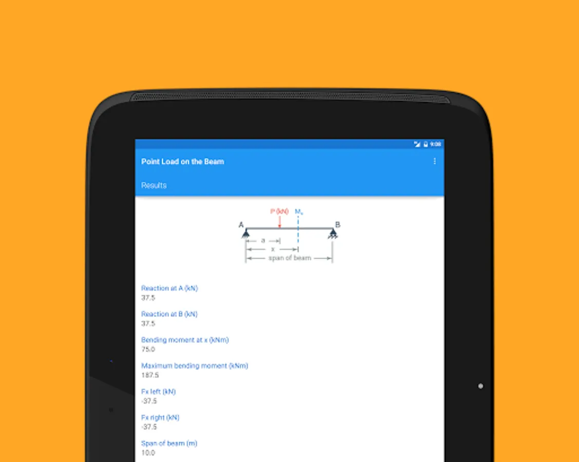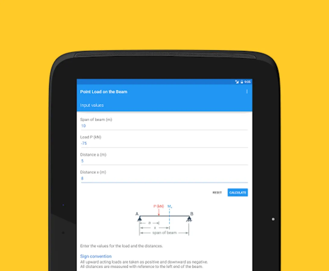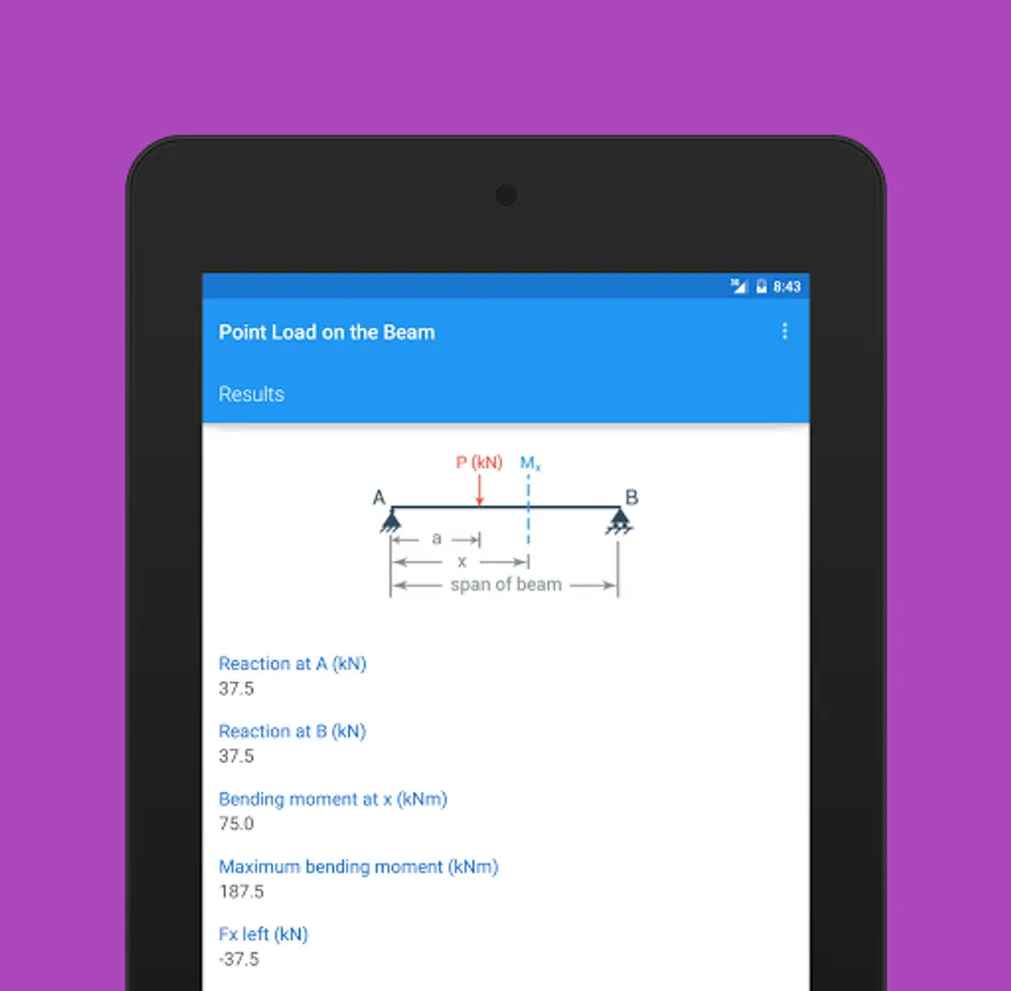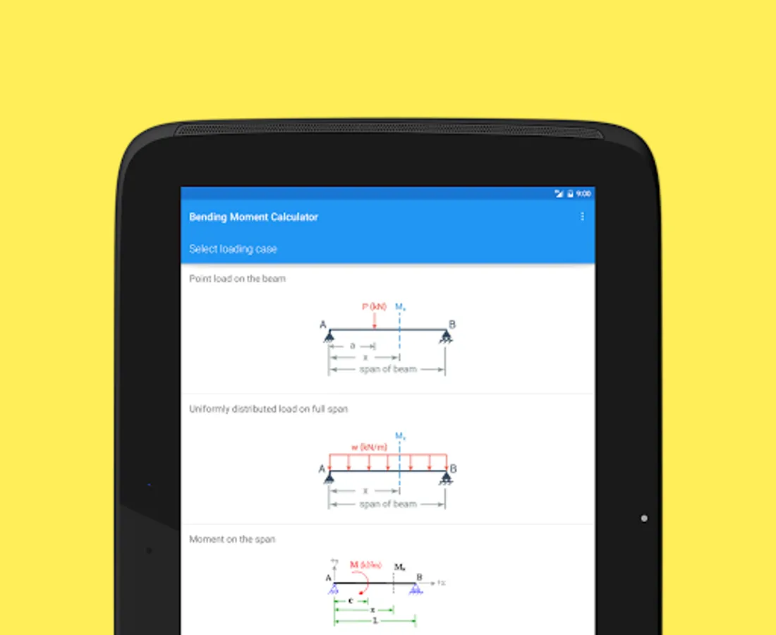 This app does not require an active internet connection for calculation of values in the case of a 'point load acting on the beam' and 'uniformly distributed load on full span', but for all other cases an internet connection is required. This constraint will be removed in future updates soon.