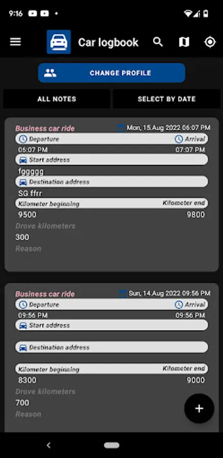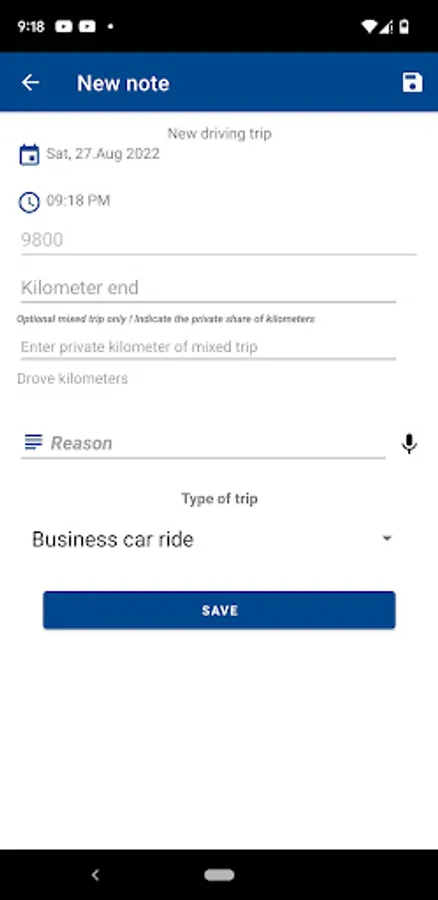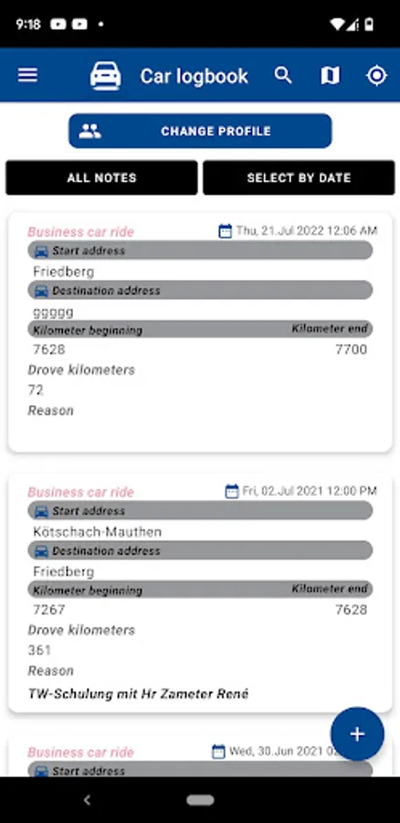 - You can enter the start and end kilometers. Indication in Miles would also be possible. In addition, the start and end addresses are available for each entry. Mileage/Kilometers and the number of miles/kilometers traveled (business or private)
