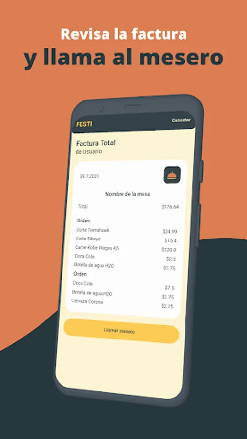 Comienza a hacer los pedidos directamente de tu dispositivo, accede a la carta de manera fácil y segura. Al entrar a la App con solo un toque podrás escanear el código QR de la mesa e inmediatamente te presentaremos toda la carta, tan simple como añadir tus platos favoritos y personalizar tus órdenes. Donde automáticamente llegara a manos del restaurante y se procesará el pedido de forma rápida. No hay límites con Festi!