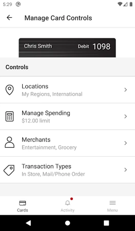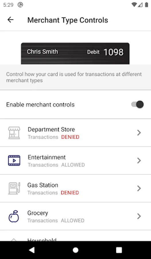 You can establish spending limits to allow transactions up to a certain dollar value and decline transactions when amounts exceed your defined thresholds. Transactions can be monitored and managed for specific merchant categories such as gas stations, department stores, restaurants entertainment, travel, and groceries. And your transactions can also be monitored for specific transaction types: in-store purchases, e-commerce transactions, mail/phone orders and ATM transactions.
