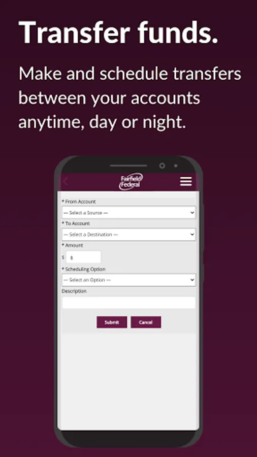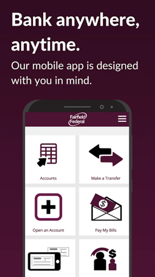 Bank on the go using your mobile device with Fairfield Federal’s Mobile Banking App. Whether you need to view account balances and transaction history, transfer money between your accounts, pay bills, or deposit a check, you can do it all any time, any day with our Mobile Banking App. Available to all customers with a Fairfield Federal online account.