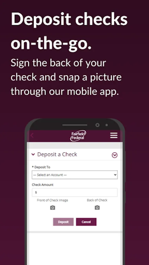 Access exciting new and enhanced mobile banking services. With the new Fairfield Federal Mobile App you can open a deposit account, deposit a check using the camera on your mobile device, manage your debit card using Card Control, and send and receive payments from others using Zelle.