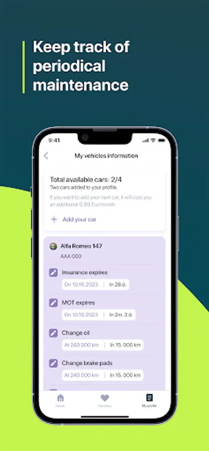 • Easily keep track of your vehicles' maintenance work schedule. When to change brake pads, air filters, or engine oil.