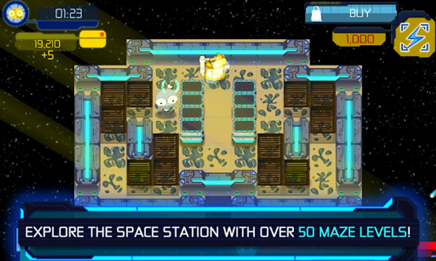 • Explore the space station with over 50 virus filled maze levels!