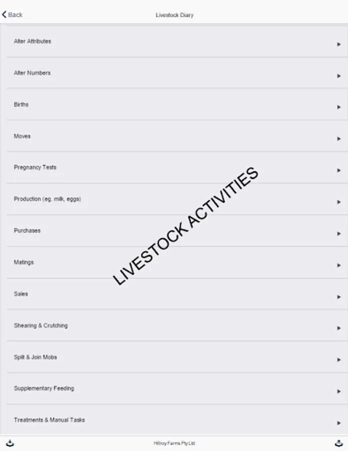 o Livestock Diary – used for recording livestock events: movements, veterinary treatments, supplementary feeding, shearing, branding, breeding, purchases, sales, births, deaths etc.