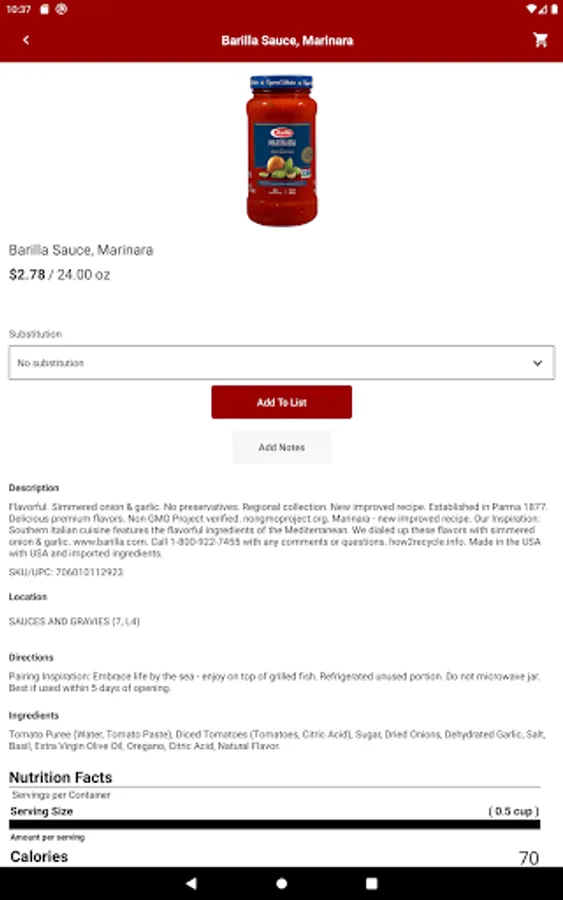 View information about products, including pictures, descriptions, ingredients, instructions and nutrition information.
