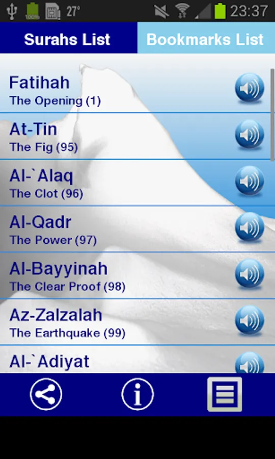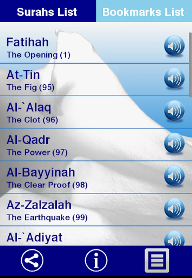 This app lets you listen to the recitation of Last 20 Quranic Surahs that can help you to memorize these Surahs.