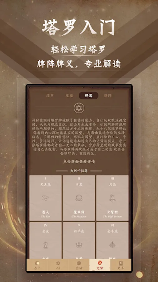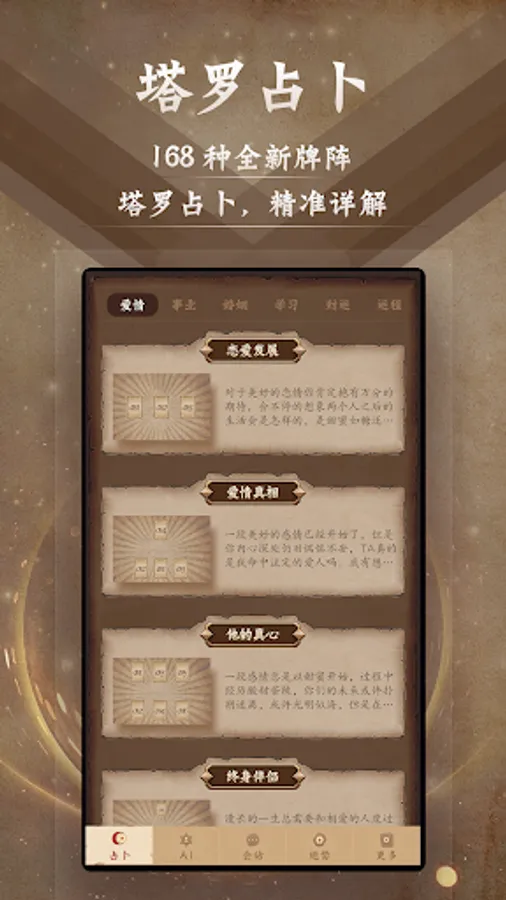 [Divination gameplay] The 22 classic Alcala gameplays, combined with the 168 kinds of cards carefully designed by the Tarot Master, each of them will provide you with an explanation of the meaning of the cards, so that you can clearly know that you are in love, study, and marriage , Interpersonal, career, wealth, health, future direction of luck, let you know more about your past, present, and future.