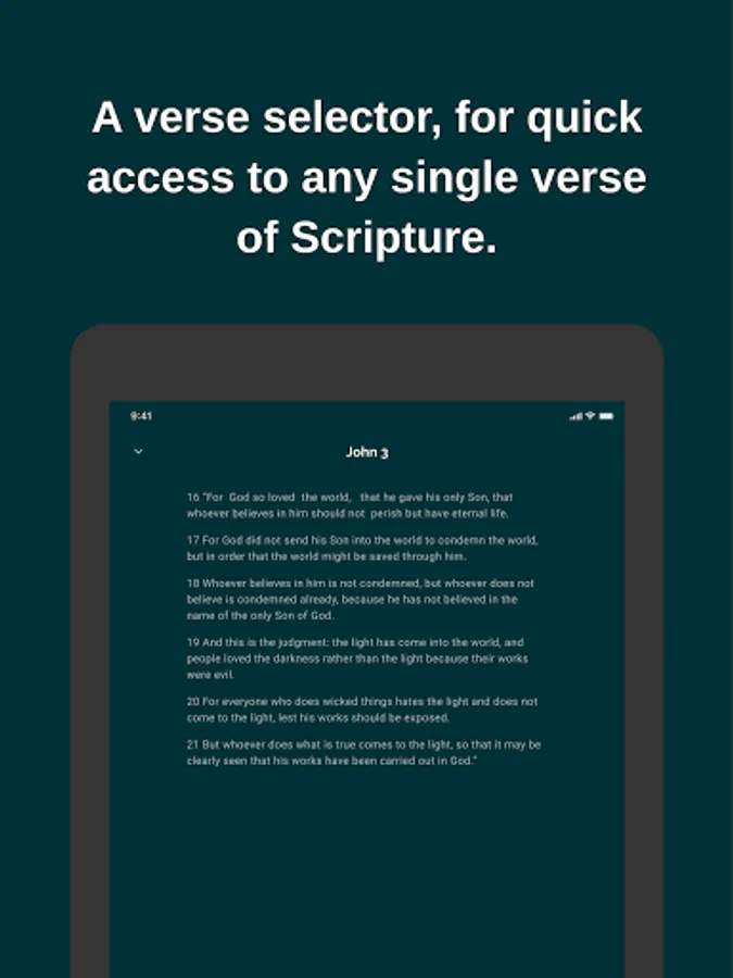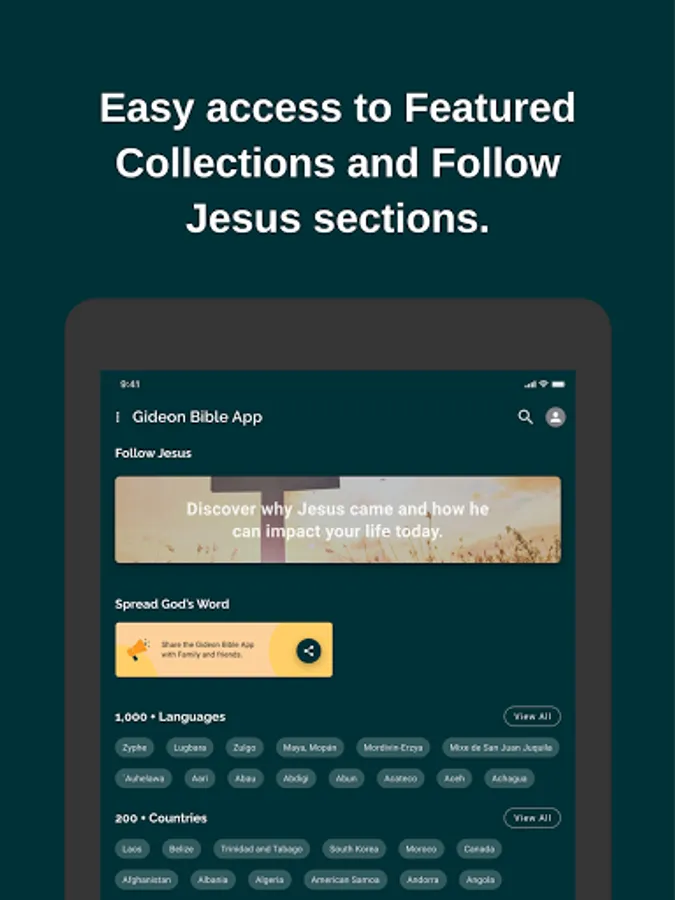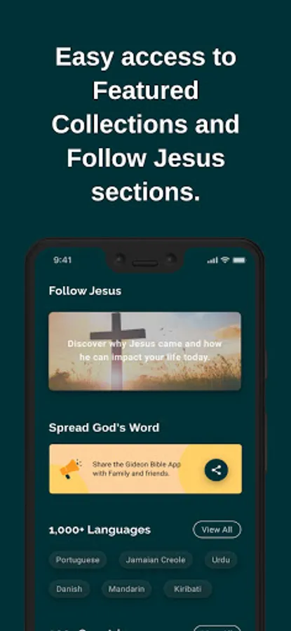 - Easy access to Featured Collections and Follow Jesus sections(The Featured Collections allow users to quickly access portions of Scriptures as they navigate times of need, deal with life’s problems, and seek to live a Godly life. The Follow Jesus section walks users through the steps to experiencing salvation.)