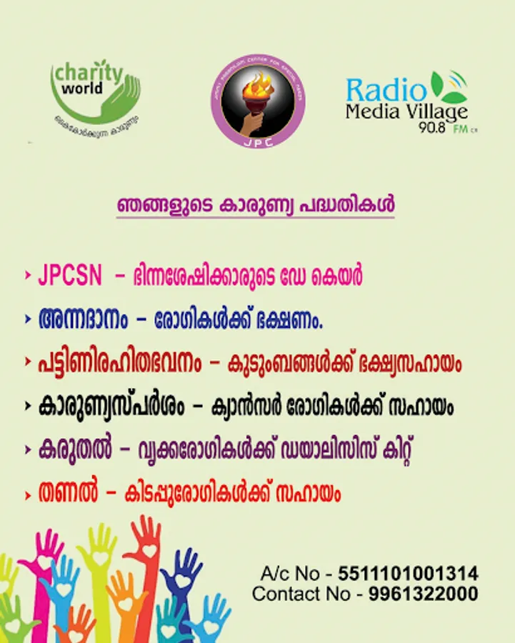 Charity World Trust (CWT), was established on the 7th May 2014 and functions in Changanacherry Taluk of Kottayam district. CWT is a non- profit, non- discriminatory entity established to serve the society at large with special focus on the sick, poor & downtrodden, the physically & mentally impaired, orphans, senior citizens etc. Over the last two years the activities gained momentum and great acceptance among the entire community cutting across all barriers of caste, creed and religion.