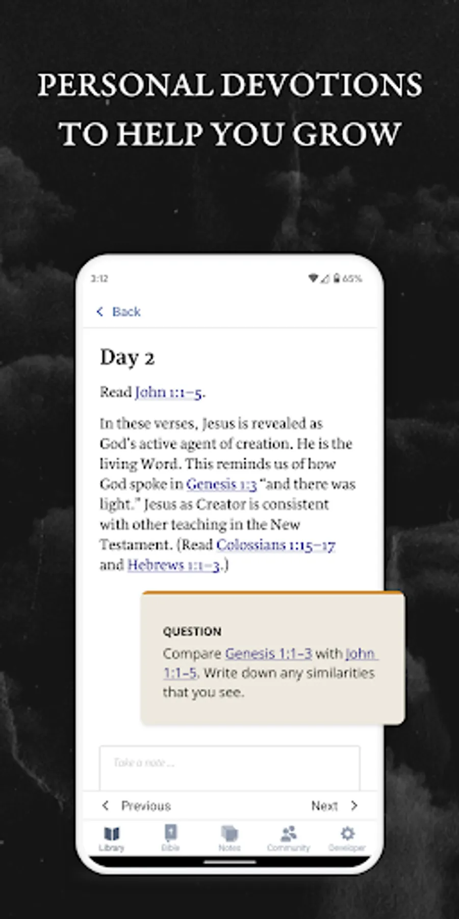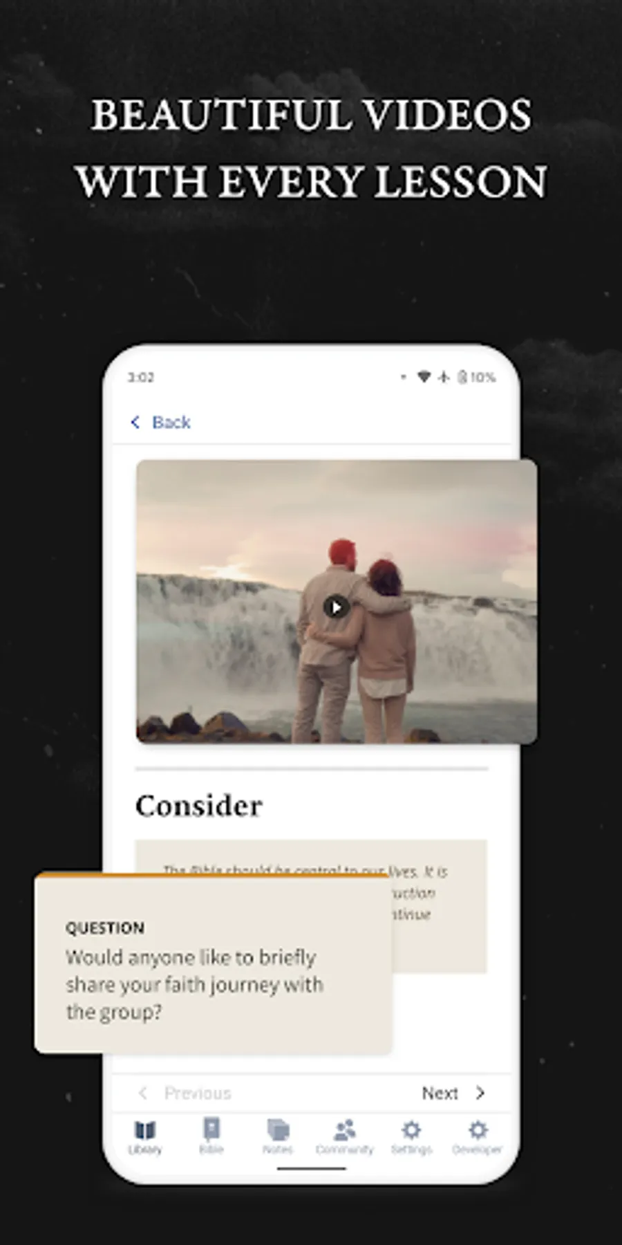 Engage as a group through thought‐provoking videos, discussion questions, and in‐app messaging features. Engage on your own throughout the week with personal devotions, access to the Bible within the app, and space for notes as you listen to what God is saying through His Word. Engage as a family with family devotions that support parents as they disciple their kids at home along with age‐aligned curriculum that equips all ages to study the same thing at the same time.