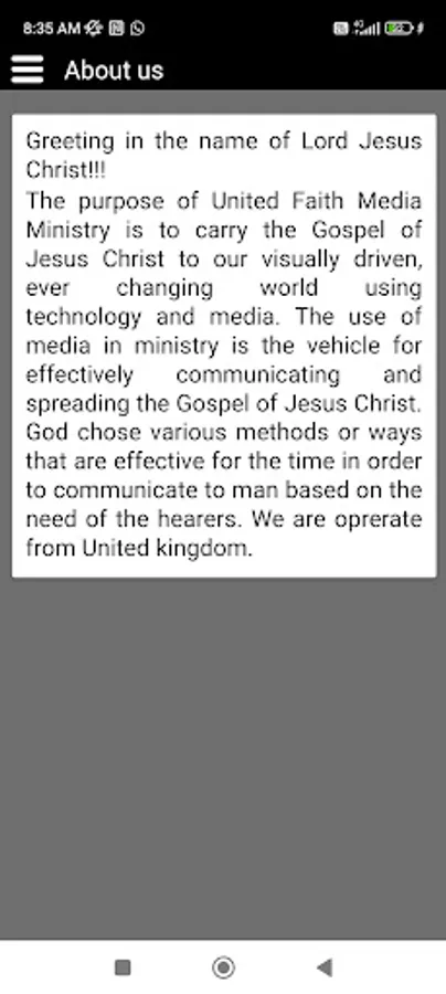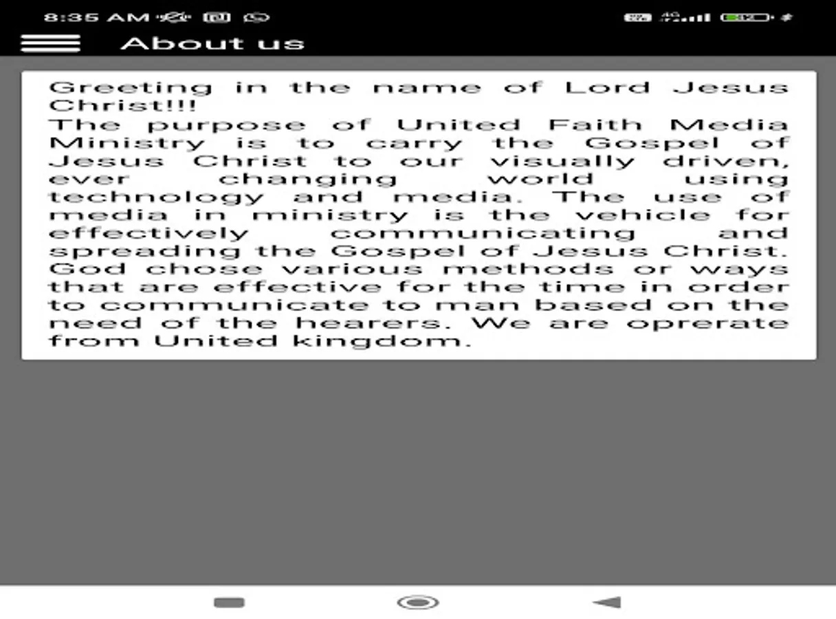 The purpose of United Faith Media Ministry is to carry the Gospel of Jesus Christ to our visually driven, ever changing world using technology and media. The use of media in ministry is the vehicle for effectively communicating and spreading the Gospel of Jesus Christ. God chose various methods or ways that are effective for the time in order to communicate to man based on the need of the hearers. We are operate from United kingdom.