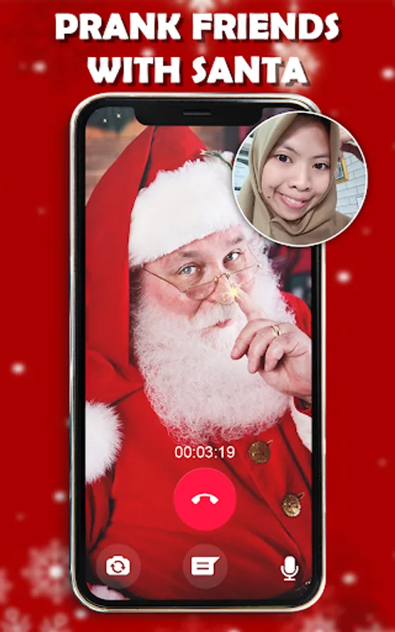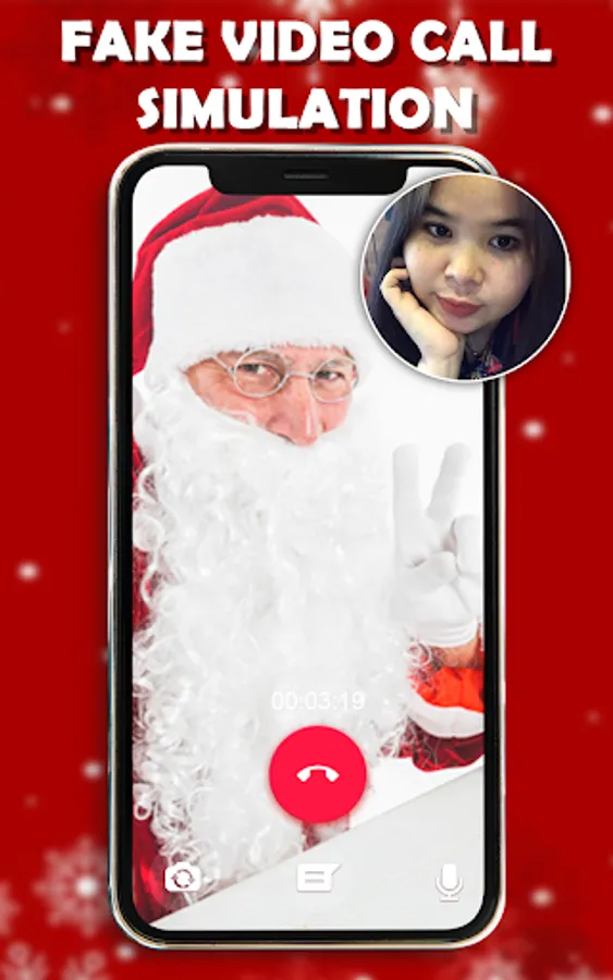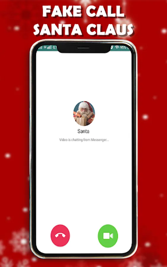 Fake Video call and Chat from Santa Claus is a simulation prank app that fakes incoming calls and fake incoming video calls, and simulate fake conversation with Santa Claus , (in case of a life video call). by a simple click you can go in a fake live with santa , itβs an easy app in order to entertain yourself and prank your friends and family and see their reaction , the calls looks so realistic and they will believe that santa is really talking to them.