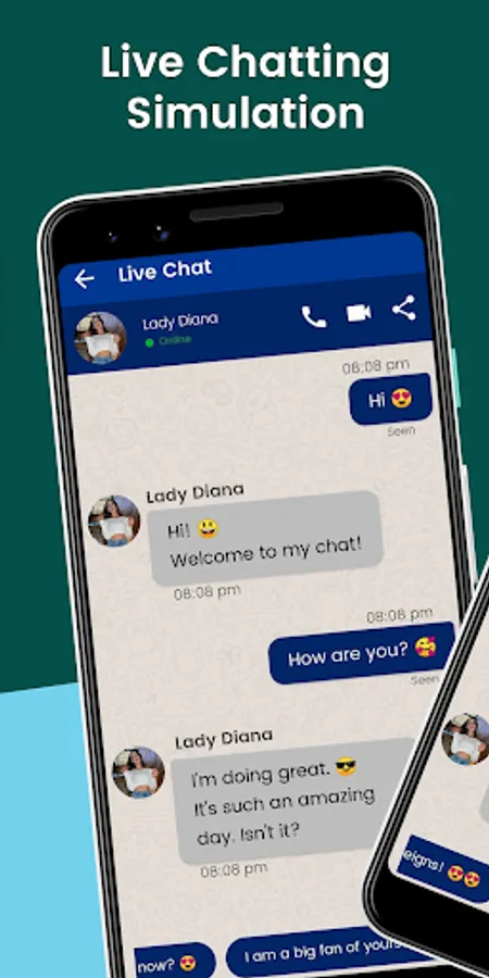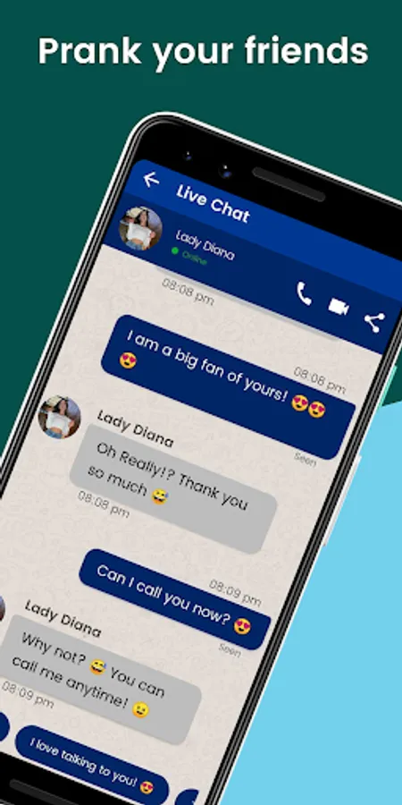 Using this application of lady diana fake chat present with high video qualities and many videos available. диана- это приложение для моделирования видеозвонков и текстовых сообщений, ориентированное на фанатов. Donwload now this correspondence of lady diana video call game simulation and enjoy the experience be able to exchange communication fake chat with lady diana messenger. This is not Lady Diana who calls, but a simulation of fake calls and fiction. This video call and prank chat live with lady diana will be featured with other artists, such as :