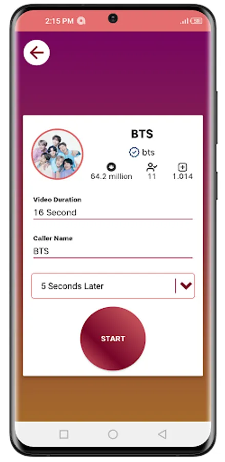 After you download the application, choose an image from the four images on the main page of the Fake call with BTS video call prank application ,And then select the time when you want to receive the fake call, for example, directly or after several minutes and press the start button, you will automatically exit from the application and the call comes after the time you chose, which makes the video call with BTS look real.