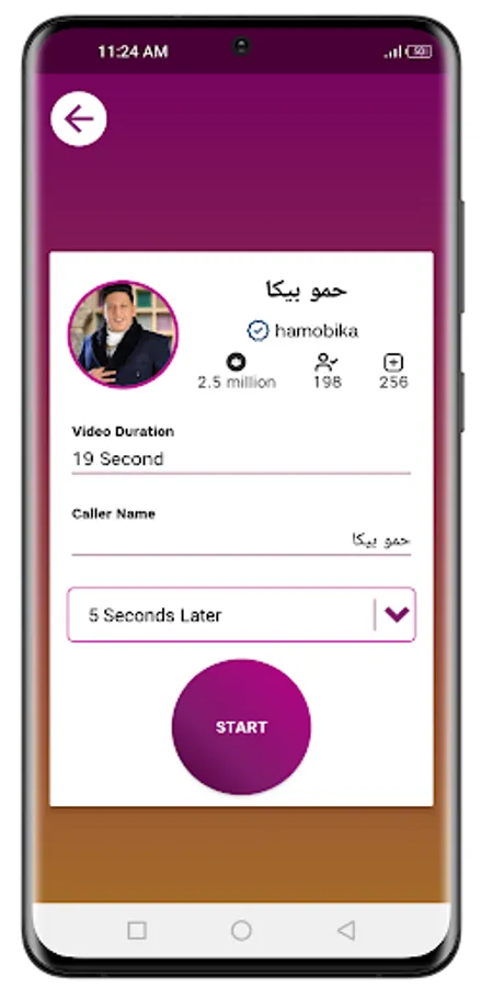After you download the application, choose an image from the four images on the main page of the Hamo Beka application calling you a video, and then select the time when you want to receive the fake call, for example, directly or after several minutes, and press the start button, you will automatically exit the application and the call will come to you after The time you chose which makes the video call with Becca's father-in-law look real.