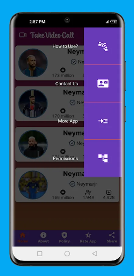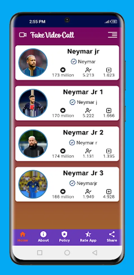 You can through Neymar Jr fake video call prank app make a video call with Neymar Jr This fake call will look like real .