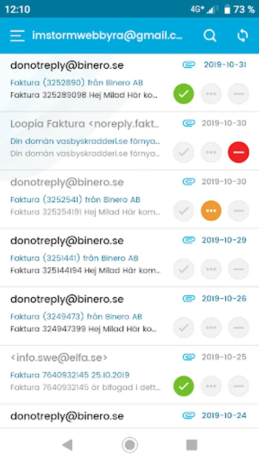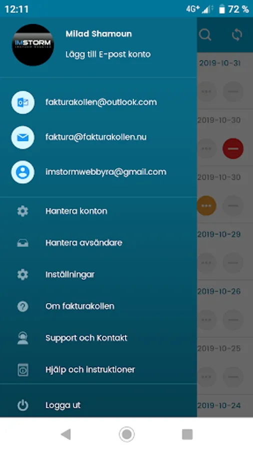 Fakturakollen samlar och presenterar de fakturor som skickas till din email på ett tydligt sätt. Fakturakollen scannar av dina email's och presenterar endast de e-post som är faktura relaterade. Du kan därefter markera varje e-post/faktura som Betald, Avvakta eller Bestrida. Fakturakollen stödjer mailkonton Google, Outlook, Office 365 och IMAP (egen domän).