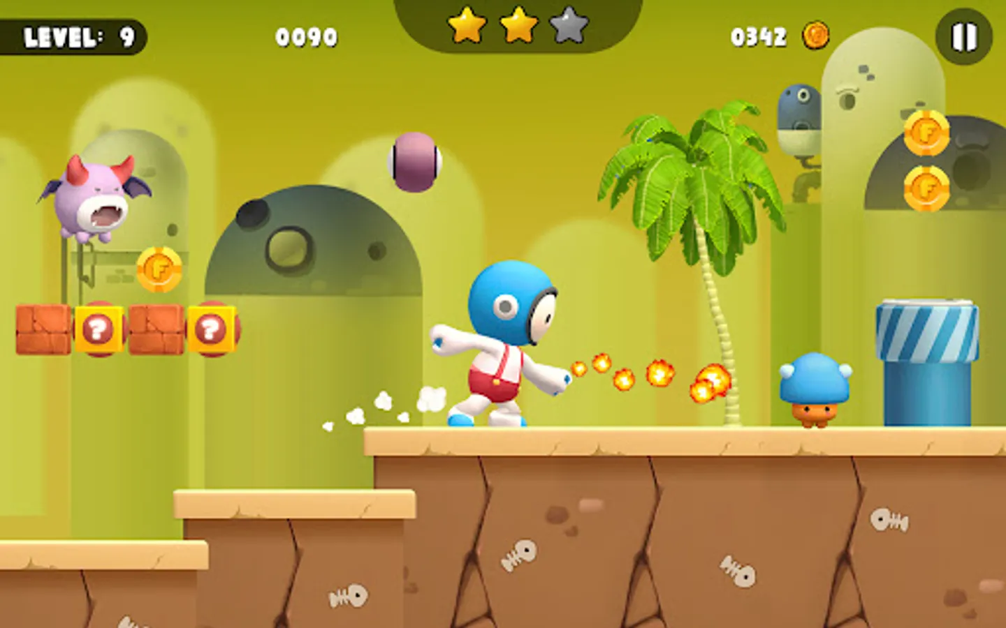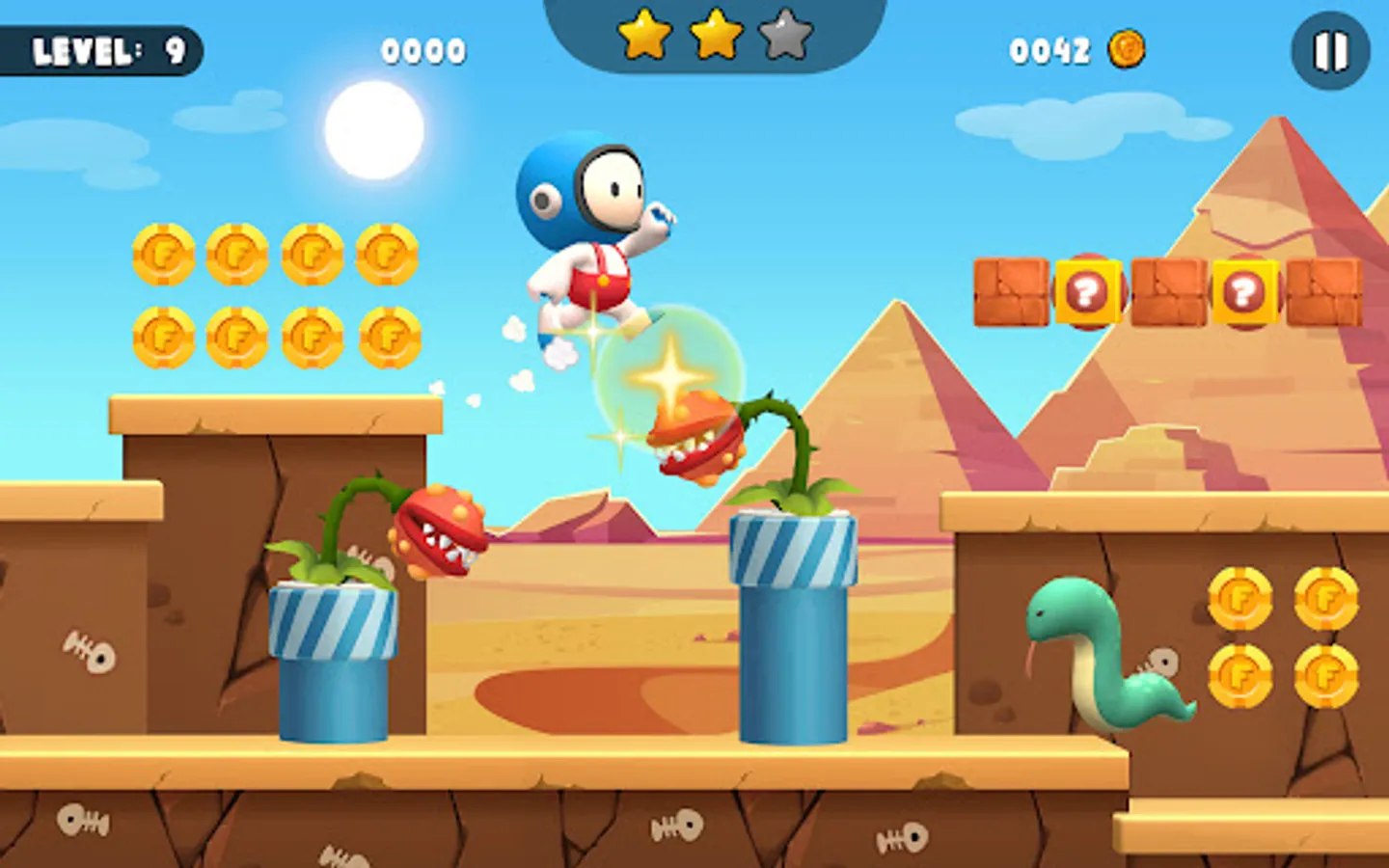 Your task is to help main character to run through the mysterious jungle, jump over obstacles, collect coins and powerful items that hidden in the bricks to help you easily defeat monsters or have a chance to revive. Don't forget the important mission to save the beautiful princess at the final destination. This game is a interesting game and you can play it offline.