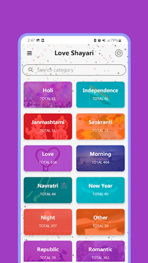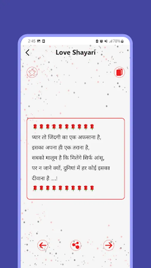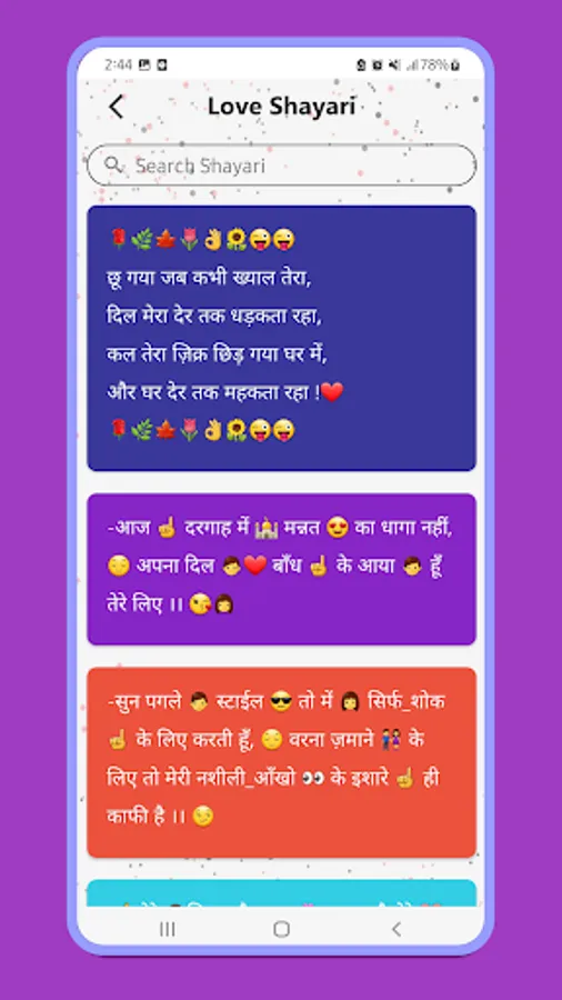 This app is the right place for Specially Romantic Shayari on every in class categories like Romance ,Miss you Shayari, Pyar Shayari, Mohabbat Shayari, Propose Shayari etc.