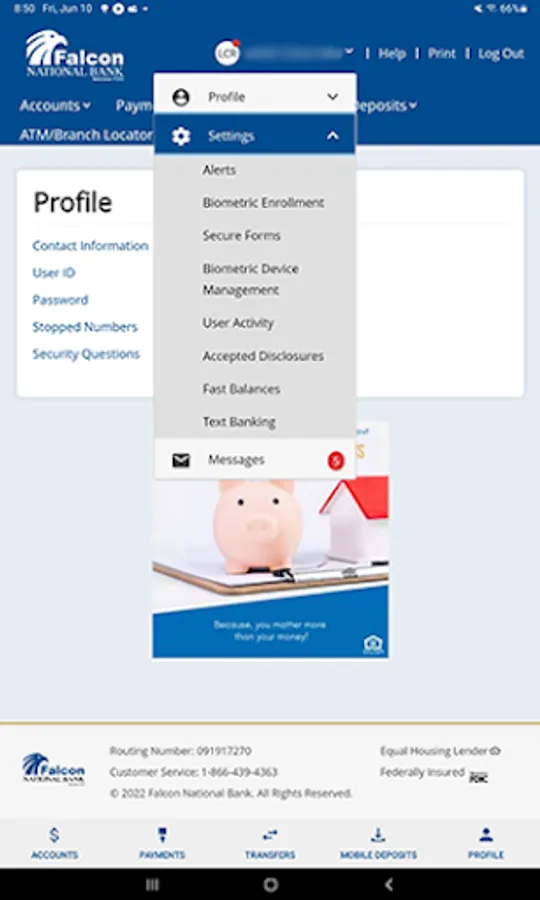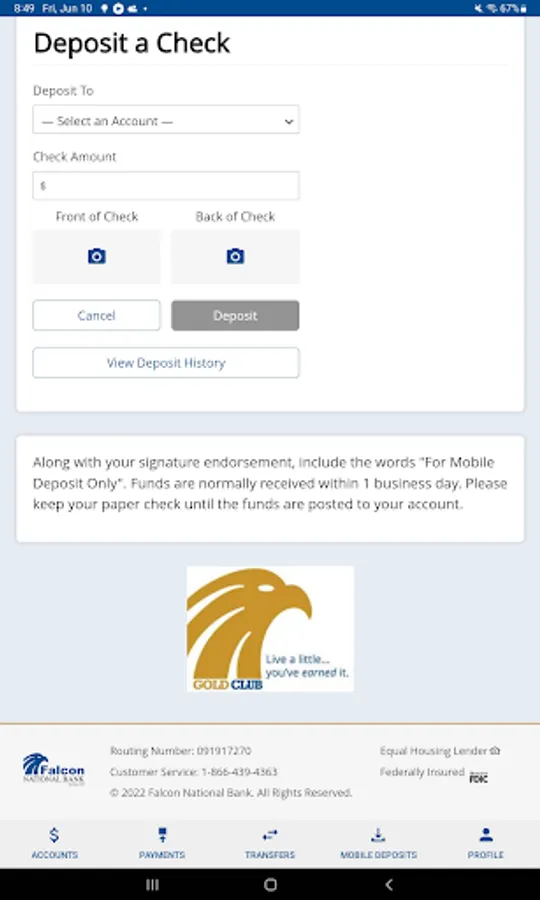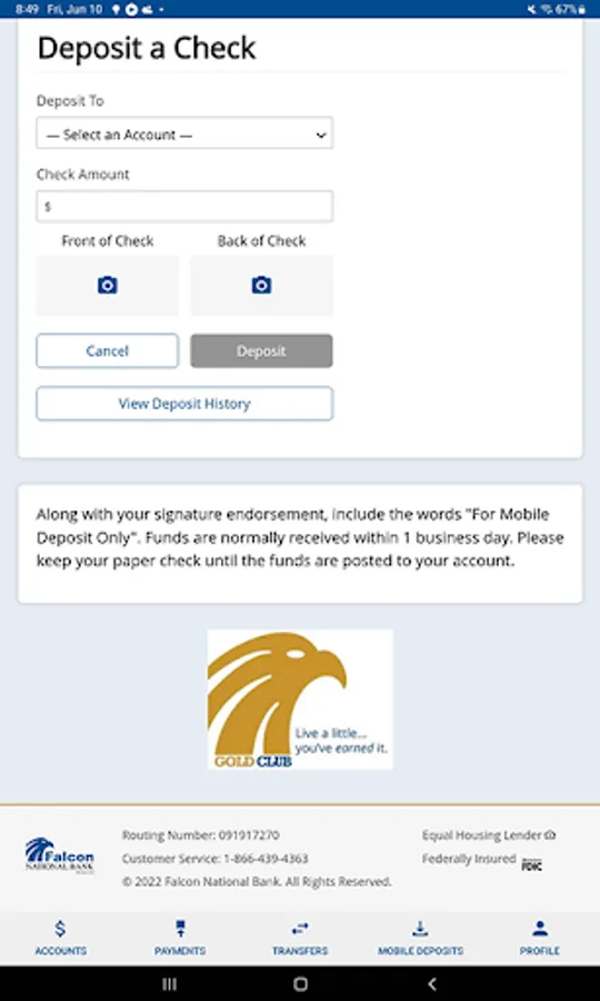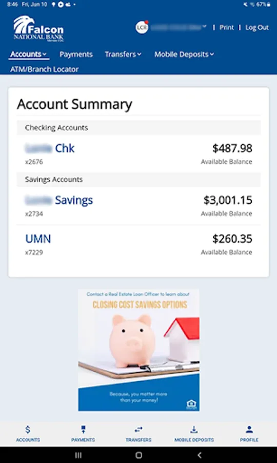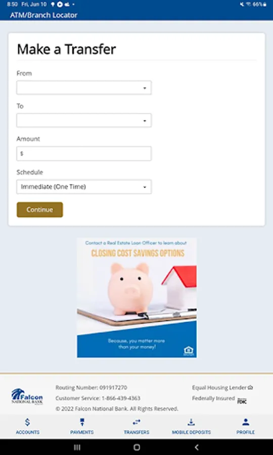 There are no access fees imposed from Falcon National Bank. However, connectivity and usage rates may apply. Contact your wireless service provider for more details.