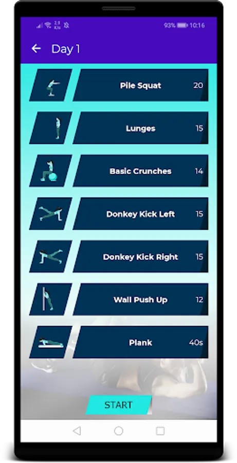 Alternating Jump Lunge, Alternative Heel Touch, Basic Crunches, Bench Dips, Bicycle Crunches, Bridge, Burpee, Calf Raise, Flutter Kicks, High Knees, Jumping Jacks, Leg Raise, Leg Up Crunches, Lunge, Mountain Climbers, Plank, Plank with Leg Lift, Pushups, Side Plank, Sit Up, Squats, Straight-Arm Plank, V Crunches, Vertical leg Crunches, Wall Sit, Wide Squat and Wide-hands pushup.