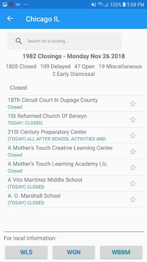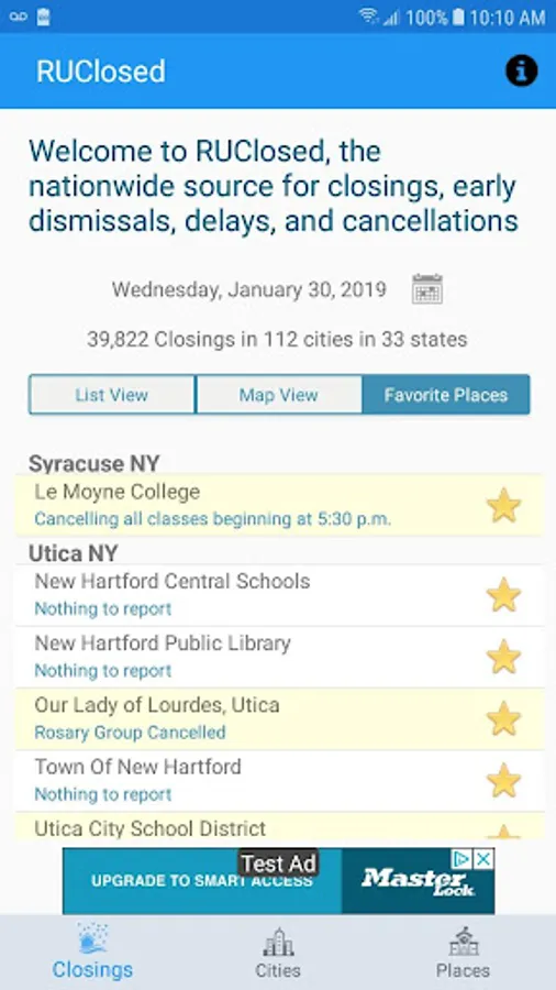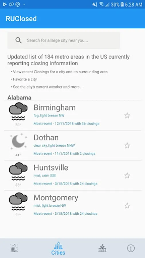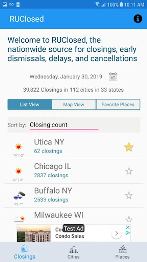 RUClosed provides a clean, easy-to-use, interface that allows users to track closings nationwide. Whether it’s your school, work, or church, this nifty little app provides the flexibility to see cancellations of all types in cities across the United States.