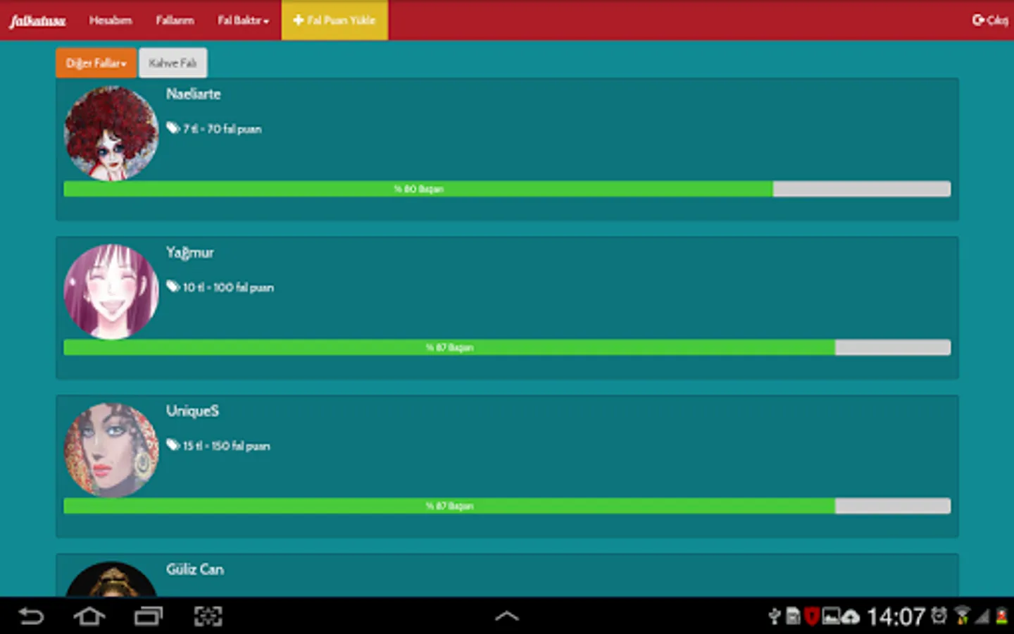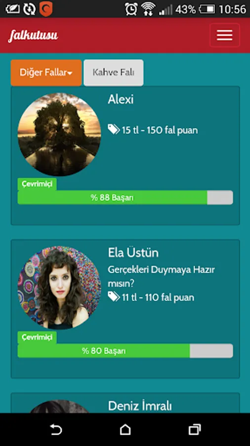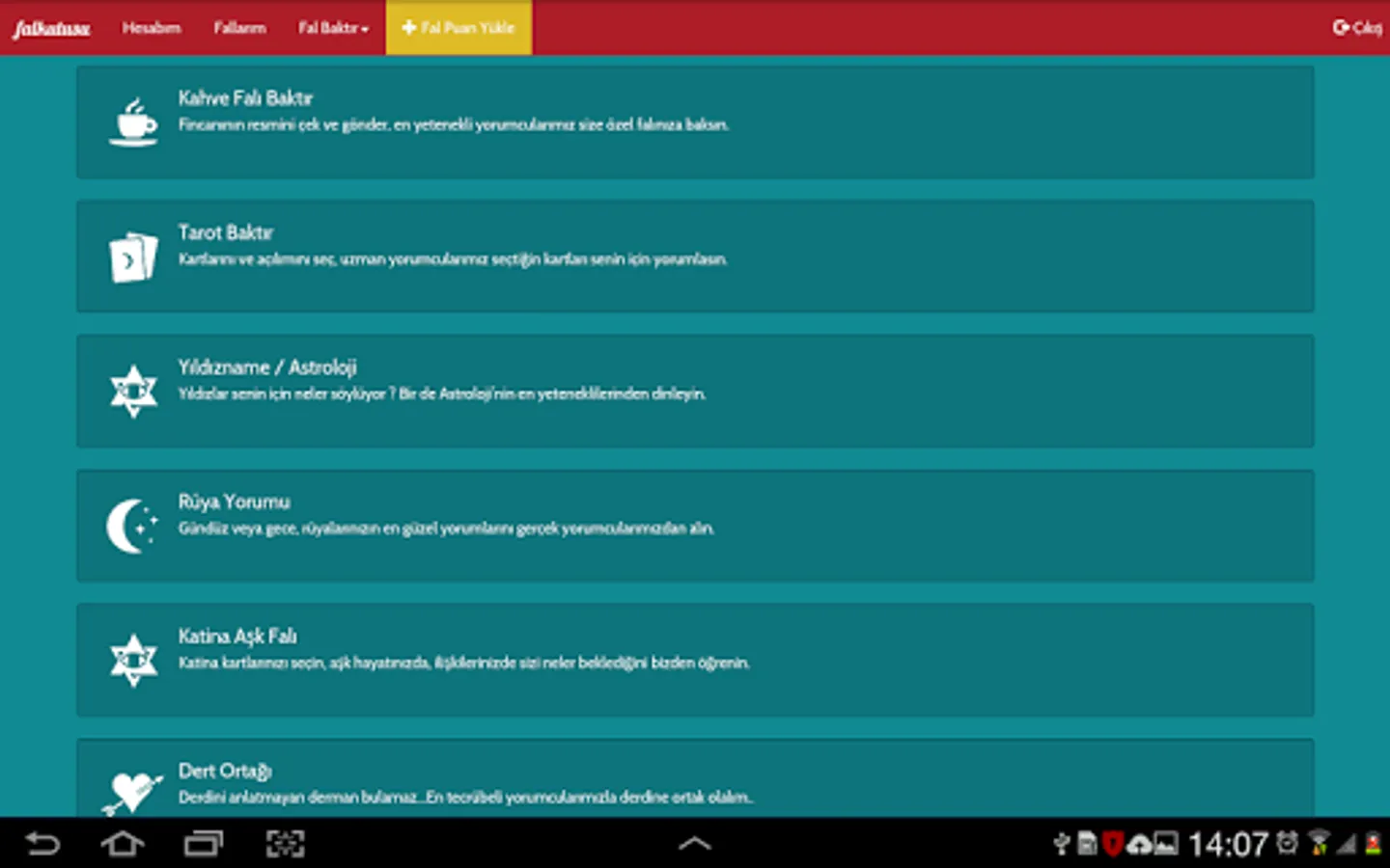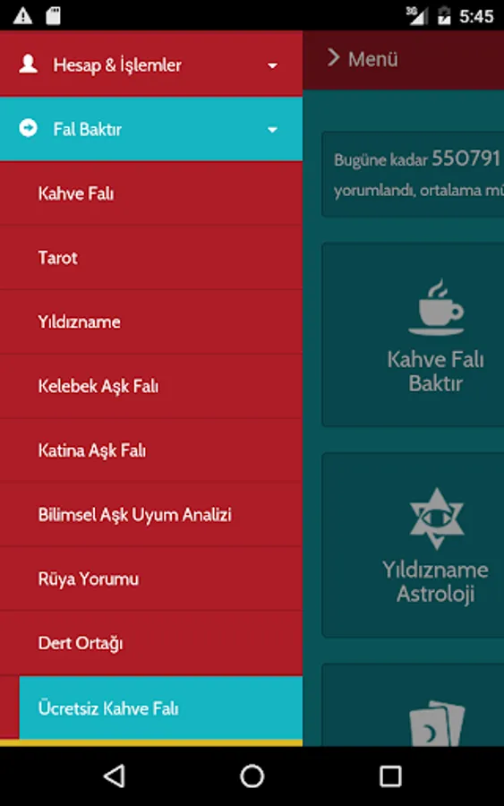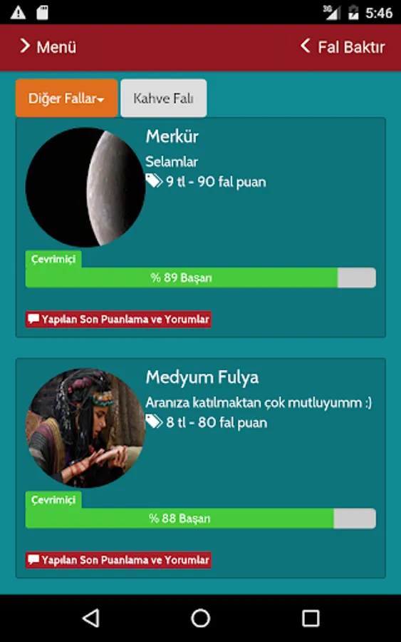 You can have a free coffee fortune 3 times a day from our mobile applications, or you can ask our talented commentators to get Coffee Fortune, Tarot, Katina, Yıldızname, Butterfly Fortune, Dream Interpretation or share them with your troubles.