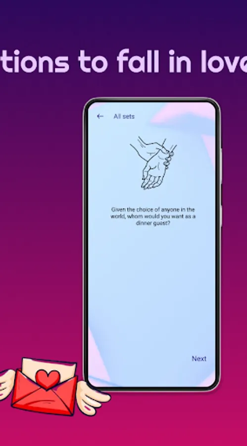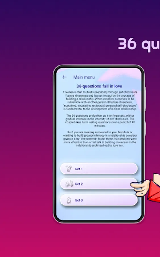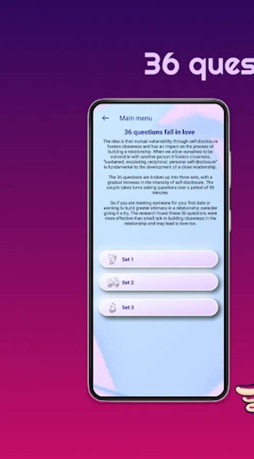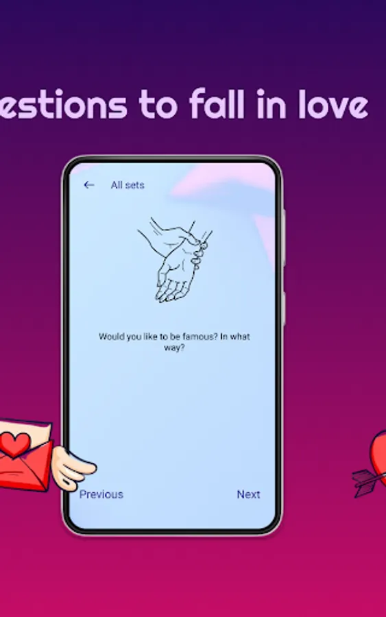 The love application also contains these 36 interesting questions that will help to fall in love with a partner, but they must be answered sincerely, and after each question to look in the partner's eyes for 2-4 minutes, it is scientifically proven. 💑