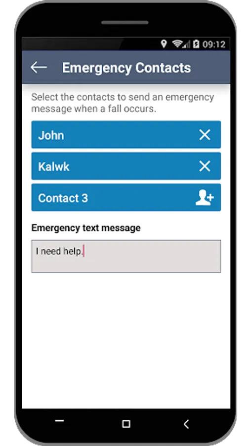 • Send an alert message to selected contacts after a fall is detected. An emergency message will report the date, time, and place where the incident occurred.