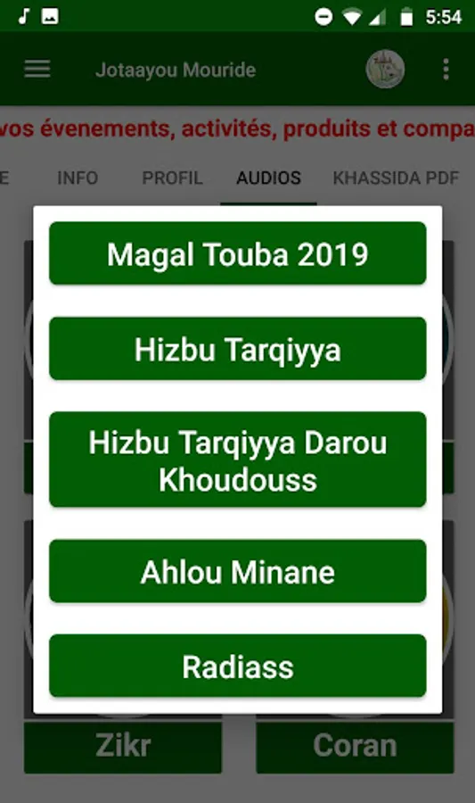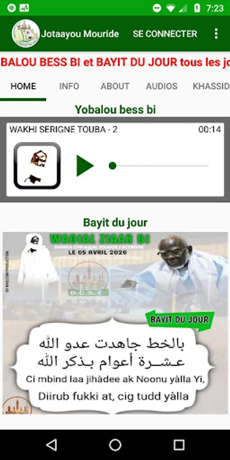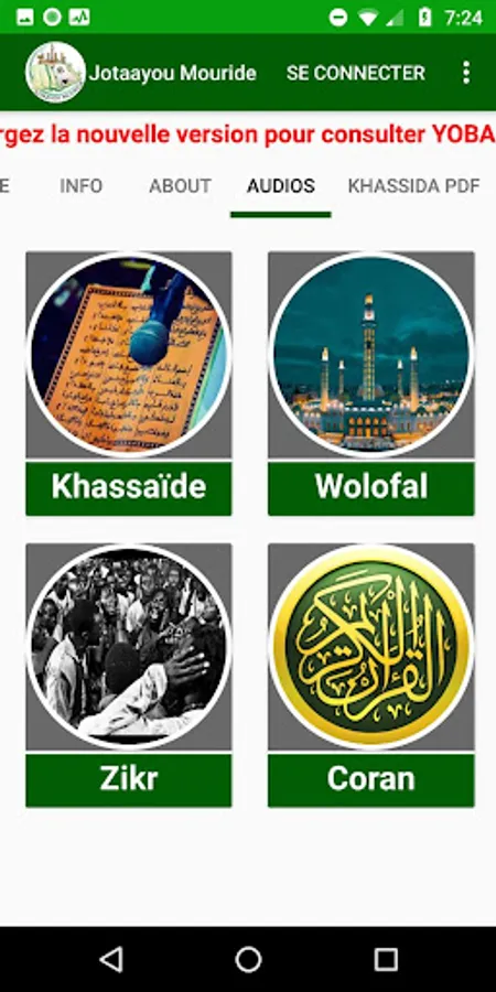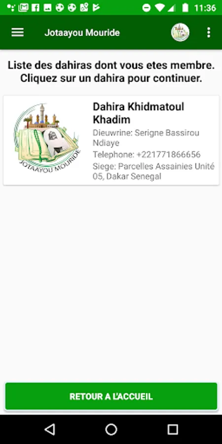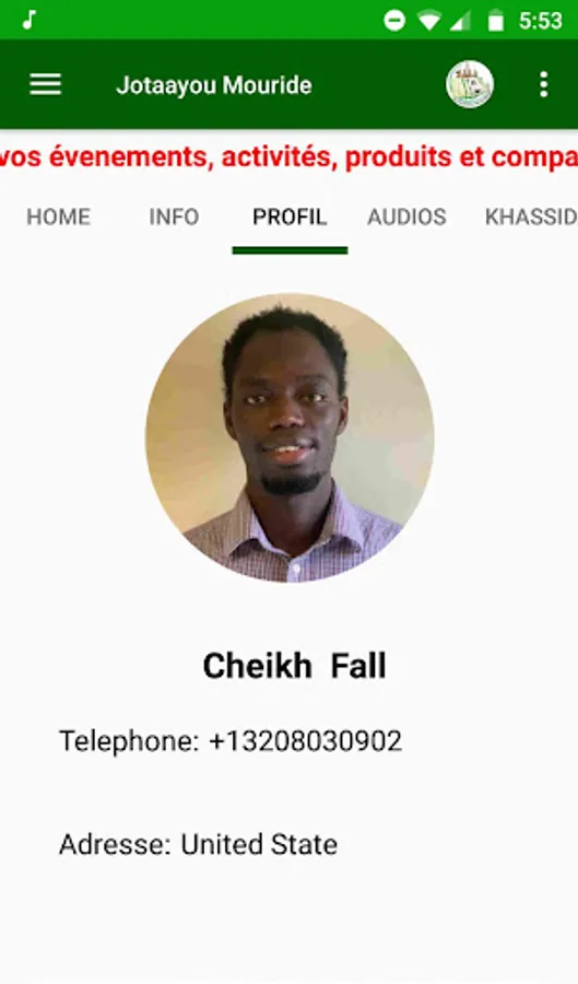 Jotaayou Mouride is an Android application that allows you to listen to Khassaid, Wolofal, the Koran, manage the members of your dahiras and the financial situation of each dahira of which you are a member. Through the application Jotaayou Mouride, anyone registered and added as a member of a dahira given by an administrator (the manager of the dahira), has the opportunity to know the sum of its various contributions (Adiya, Sass and Social) to any time and consult the expenses and the amount available in the coffers (Adiya, Sass and Social) of his dahira. The app also offers the ability to send and receive announcements (voice or written) between members belonging to the same dahira. All the more, Jotaayou Mouride allows you to publish your events that will be visible to anyone with an account in the application. Finally, all dahiras will have their own directory (audio and photo) in which they can save their data (NB: Only members designated as administrator can add audios or photos in this directory).