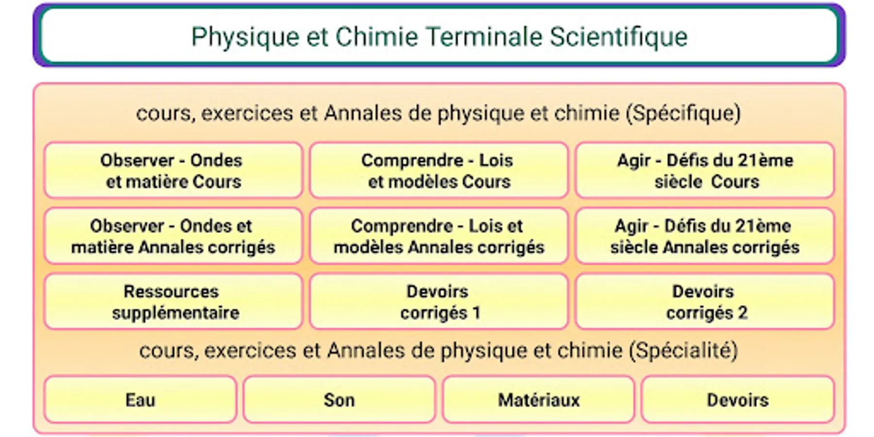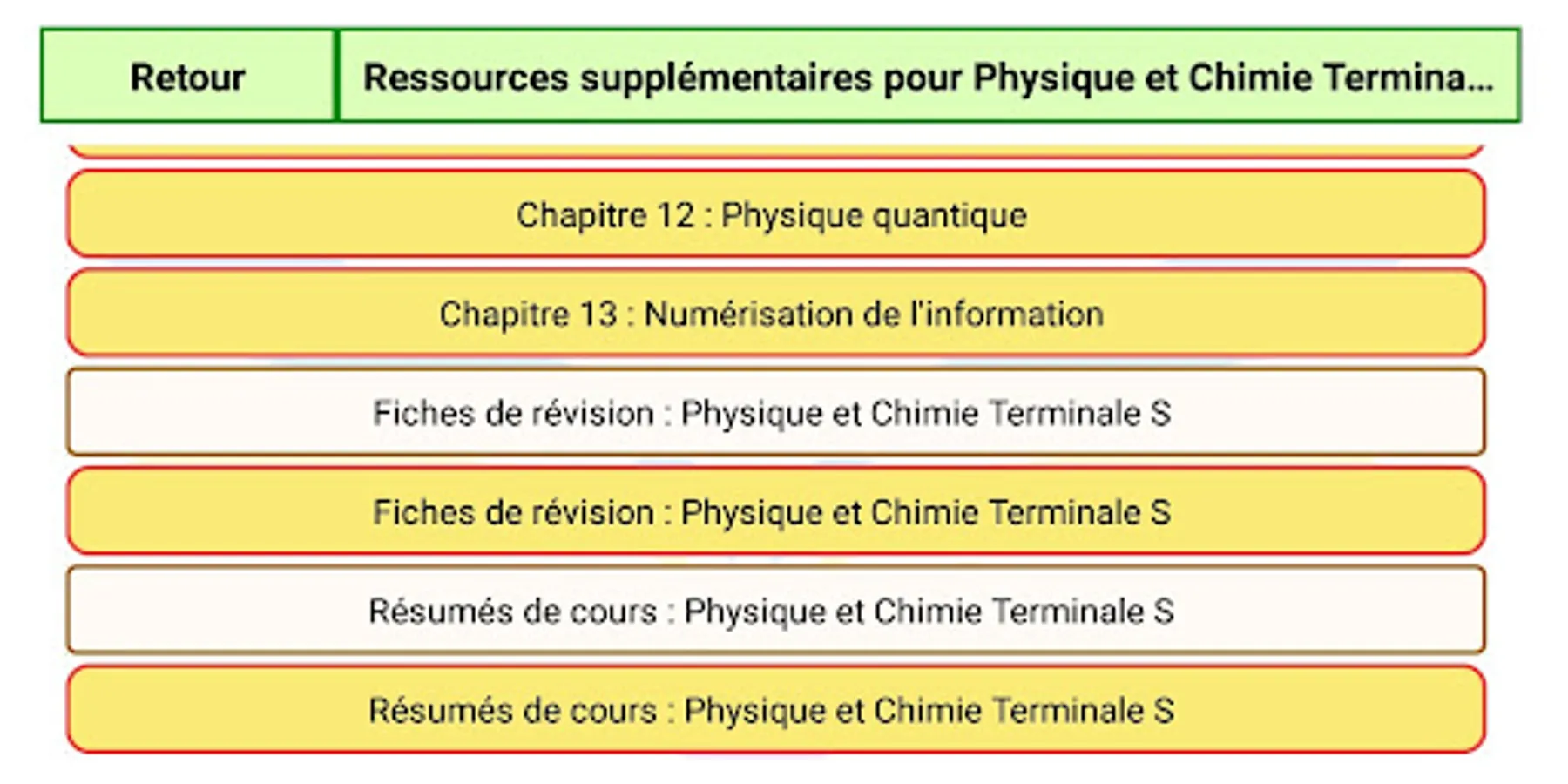 This application contains Physics and Chemistry lessons for Terminale S students, summaries of all lessons and corrected homework without Internet.