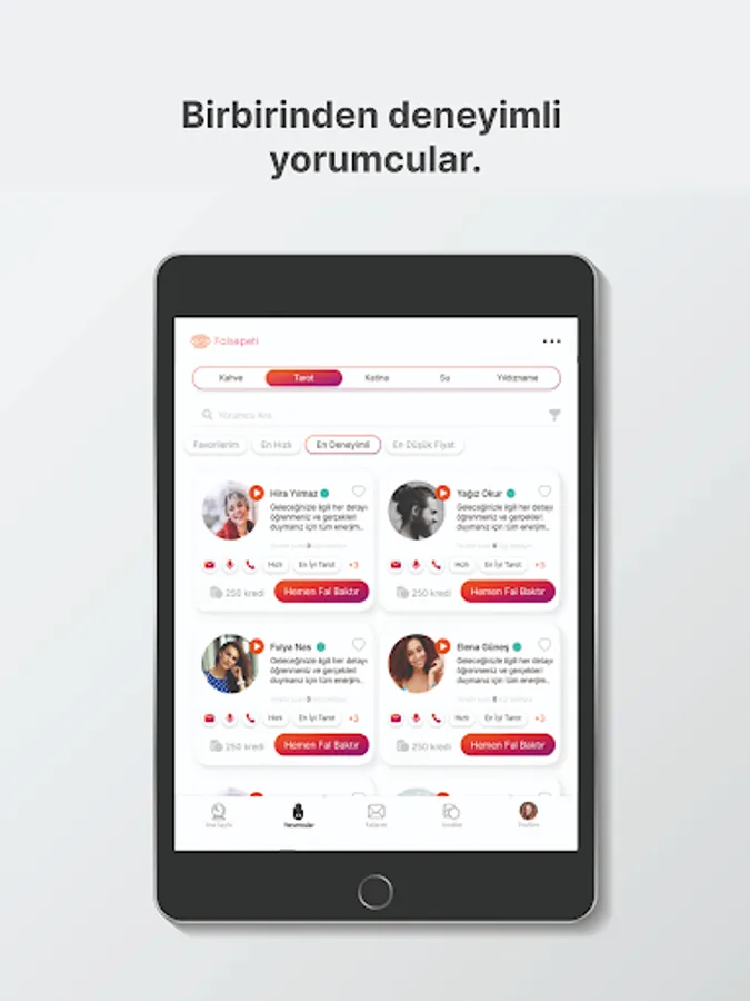 As Fortune Basket, we are changing your fortune-telling habits. Unlike other fortune-telling apps, we bring you a satisfying fortune-telling experience. We offer this service with the opportunity to make fortune-telling live online. Expert commentators in the field are waiting for you to clear the question marks in your mind. So now it is much easier to reach real commentators with Fal Sepeti!