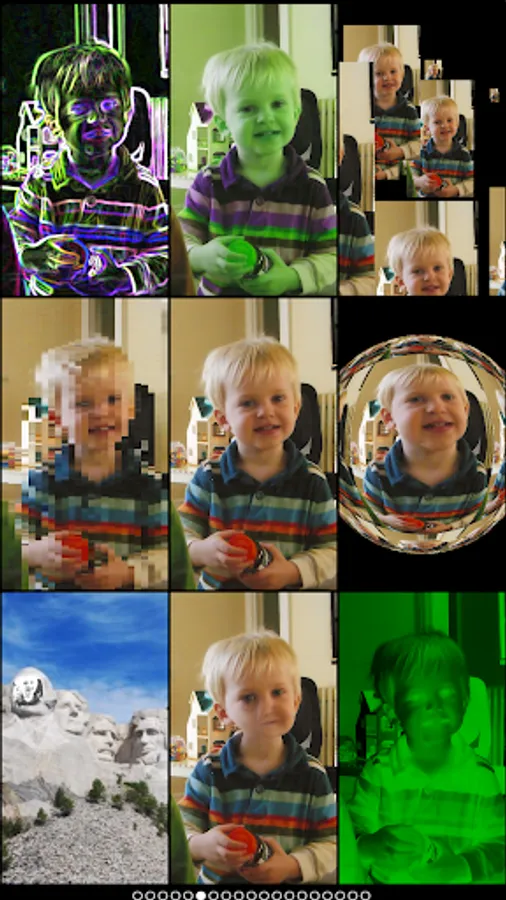 Effects include: tunnel, mosaic, puzzle, hue shift, motion blur, tile, emboss, spinning cube, x-ray, collage, night vision, halftone, light tunnel, and many more. There's also 40 vintage camera effects for a retro feel.