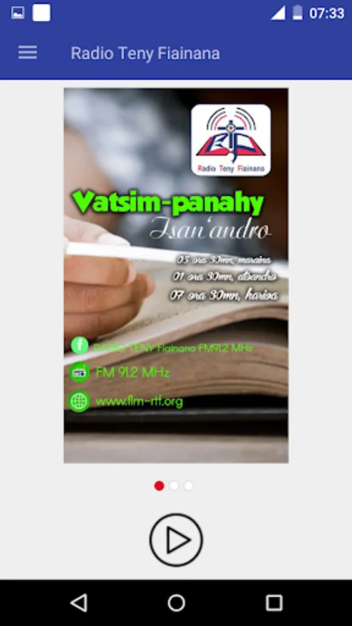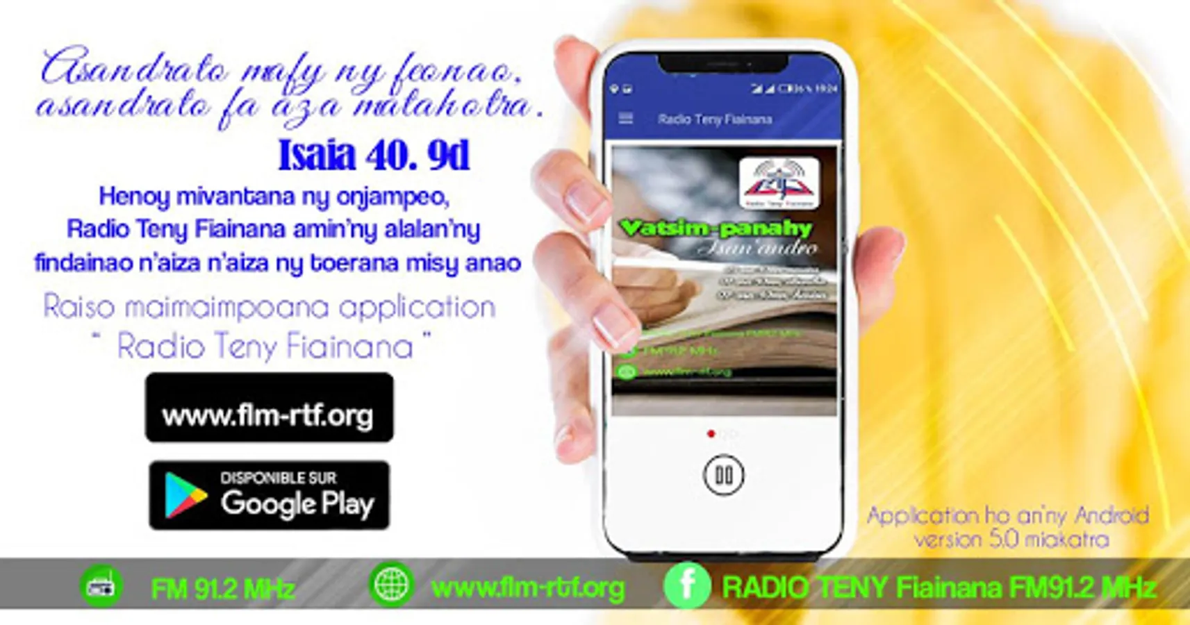Application ahafahanao mihaino mivantana ny Radio Teny Fiainana FM 91.2 MHz. The app has been posted on Google Play