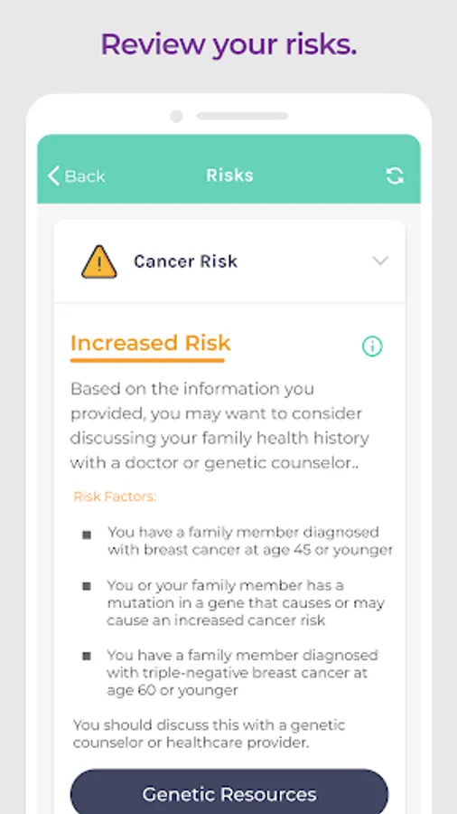 - See if you’re at an increased risk for certain diseases and whether you would benefit from additional genetic counseling or testing.