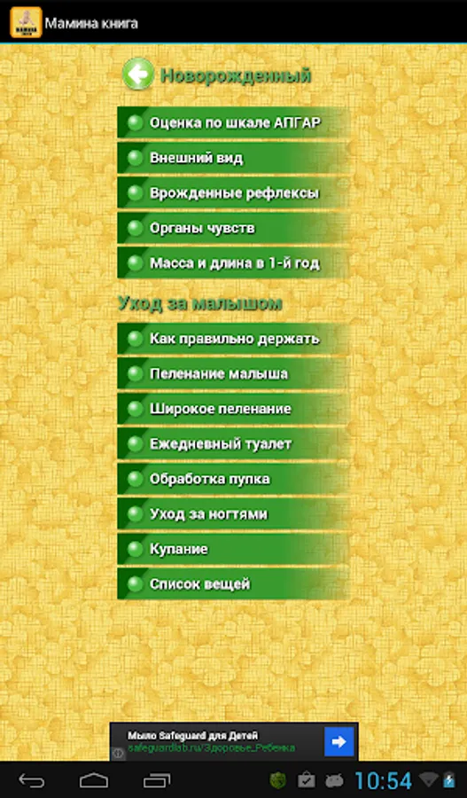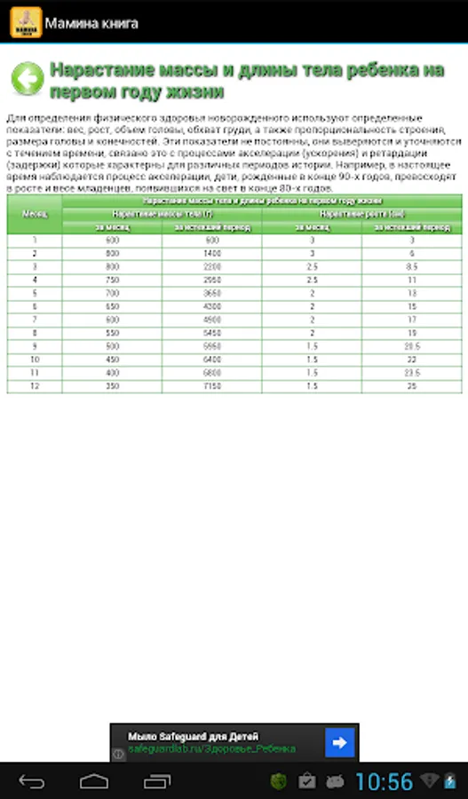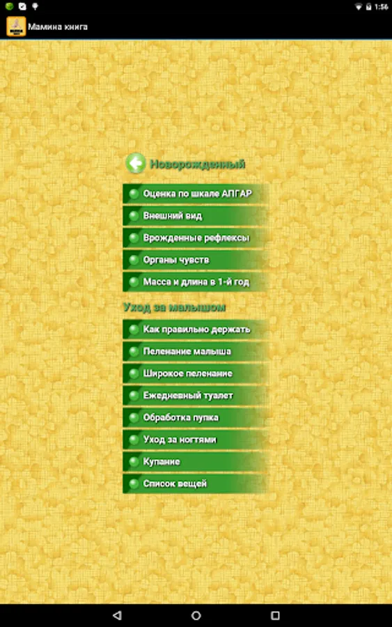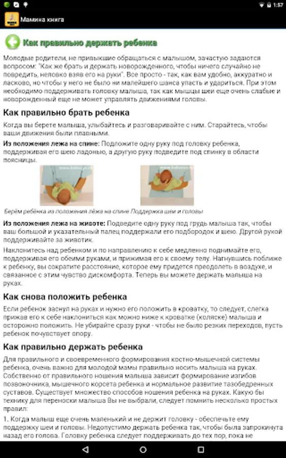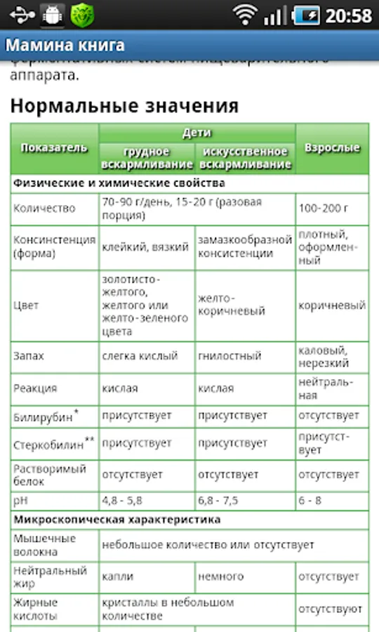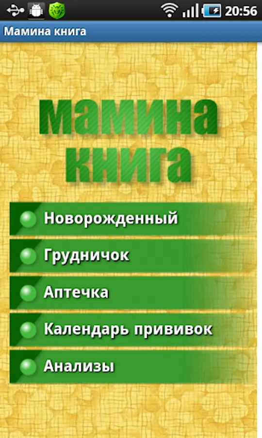 Mom's book - a brief guide for young mothers in your CellPhones. In this application, you will find information newborn babies and care for them - about swaddling, toilet, bathing. Also here you will find detailed information about the development of your child and will be able to control this process, a list of resources for kits for child care, immunization schedule, guidance for parents and contraindications for vaccination. In the section "Analysis and decoding" has detailed information about the norms and deviations indicators analyzes stool, blood and urine in children, as well as recommendations for their collection.
