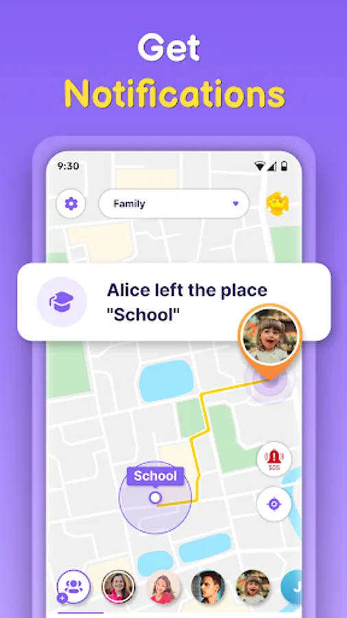 🟣 Family Locator Notifications: Users can create custom places and set up geolocation around them (home, school, work, etc.). When a kids enters or leaves a designated place, all members of the group are notified via a push notification on their device. This feature can be useful for keeping track of your children, ensuring everyone arrives safely at a destination, or monitoring the GPS location.