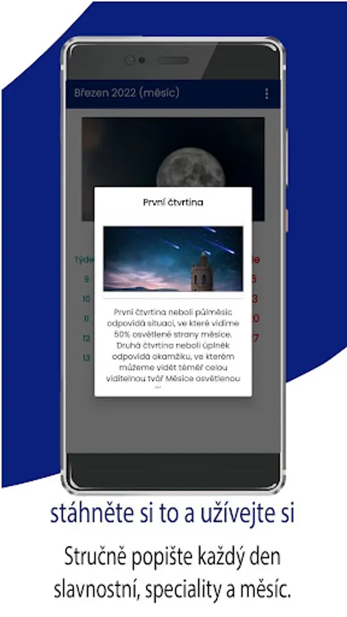 Our Czech Republic 2023 Calendar App for Android is now available on Play Store, enjoy our app. Use it as a tool to observe and search for special days, holidays, special dates, days of the week and moon phases of each month. Enjoy all content.