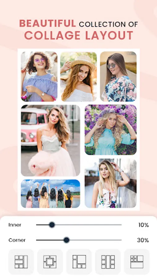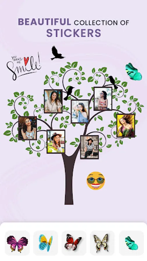 This pic collage frame app gives a variety of category stickers to decorate the family collage like agenda, alphabets, birthday, cartoon, Christmas, emoji, firecrackers, funny, love, mask, plants, social media icons, travels, and unicorn.
