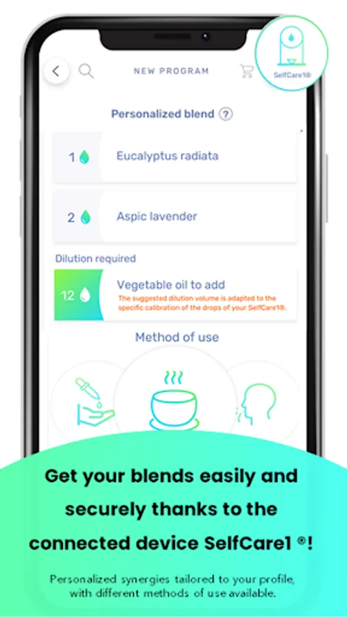 Stay in shape every day and take care of your well-being in an ecological and efficient way with just 8 essential oils! SelfCare1® offers you more than 50 well-being solutions optimizing the use of essential oils, for the whole family! Connect your app via bluetooth to easily program your feel-good SelfCare1® device and obtain your blends immediately, without dangerous handling, with the appropriate advice for use (topical use, steam inhalation, olfaction or other).