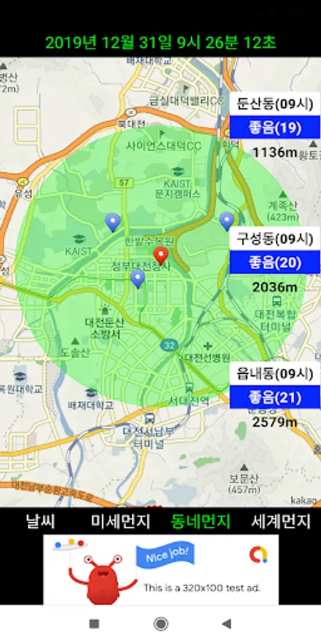 먼지날씨 앱의 첫화면은 동네먼지로 동일지역에서 가장 가까운 순으로 3개의 미세먼지 측정소의 데이터를 측정위치화 함께 지도로 표시하여 거리와 함께 제공합니다.