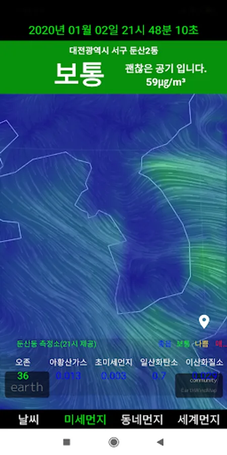 배경으로는 실시간풍향을 확인 할 수 있는 맵을 보여 주어 바람의 방향을 확인 할 수 있습니다.(에어코리아에서 제공하는 실시간 미세먼지 상세 정보가 1시간 마다 업데이트 됩니다.)