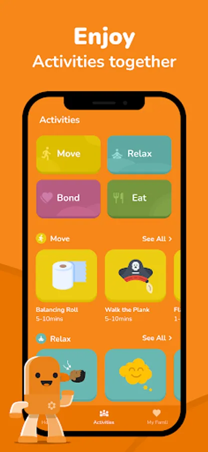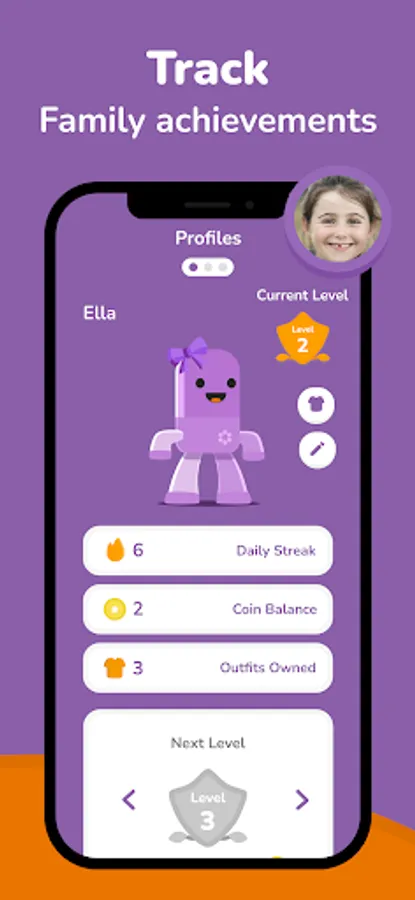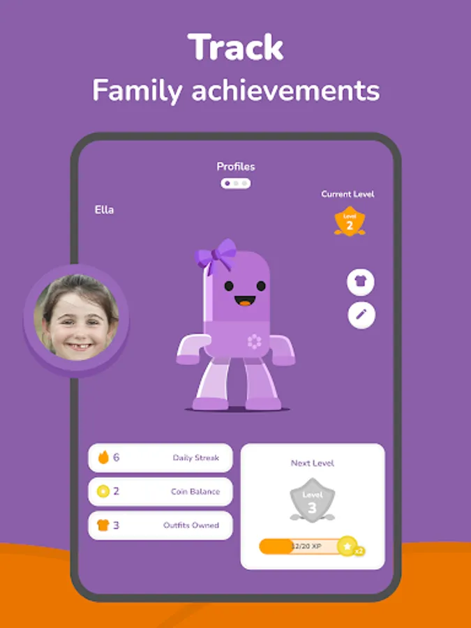 Each family member gets to choose their personal avatar! Completing activities earns you XP, and your avatars allow you to track each other’s progress and encourage friendly competition to stay motivated! You can unlock avatar outfits of your choice, personalise them, and show off your hard work. You can even go up levels!
