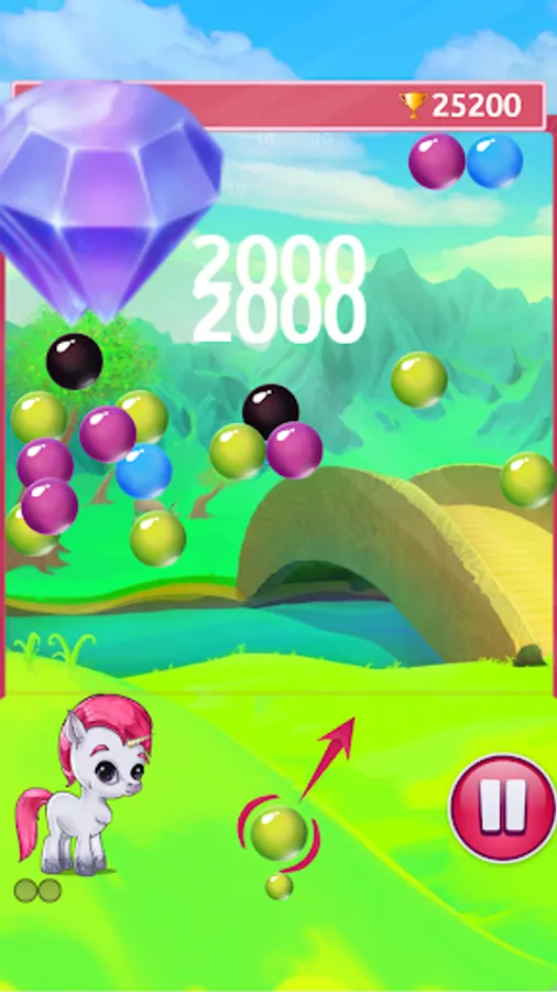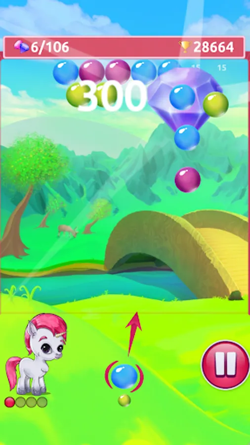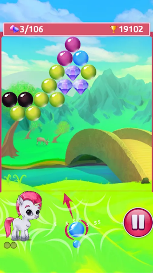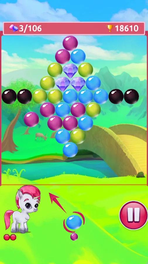 Combine at least 3 bubbles of the same color to remove them from the field. Clear adjacent bubbles to drop the gems and make the little unicorn happy. Plan ahead and play strategically - dropping huge clusters will trigger Una's rainbow move and gives you lots of bonus points! Beware of black bubbles, they can only be removed if you clear all bubbles next to them! Can you collect all gems and earn a high score?