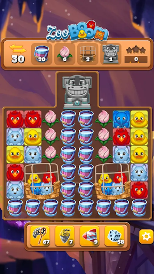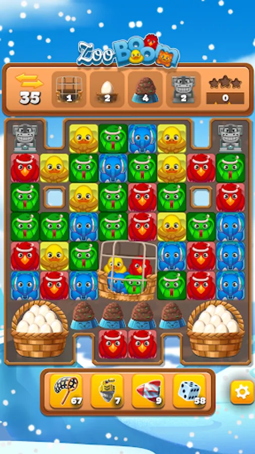 The further you progress, the more tricky the challenges will get: free animals from cages which are too tiny, destroy boxes and remove poisonous mushrooms - there's always stuff to do in your zoo! In case you are stuck and can't complete the needed tasks, simply buy additional boosters in the shop and use them in the level. Can you earn all stars in Zoo Boom?