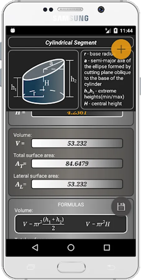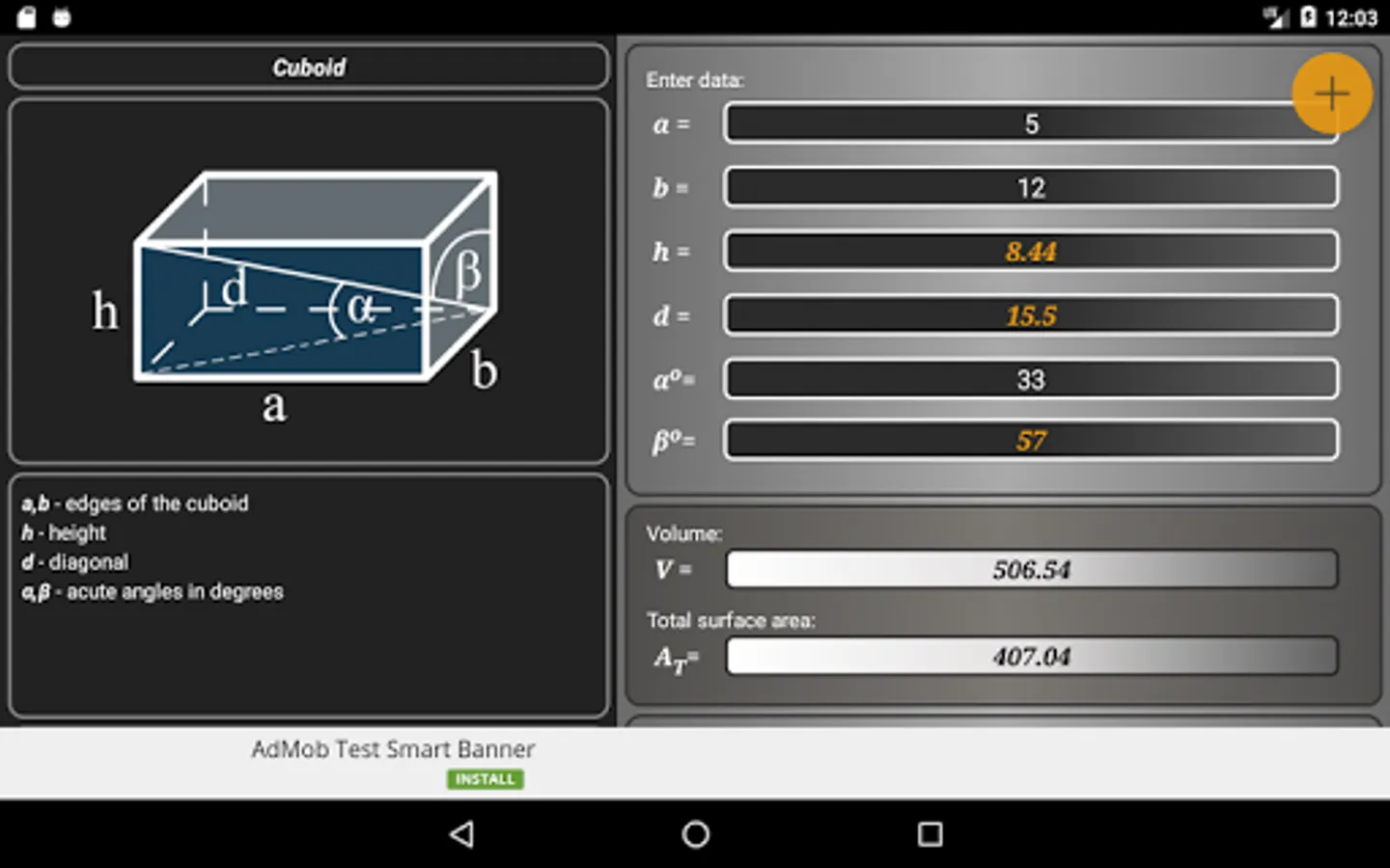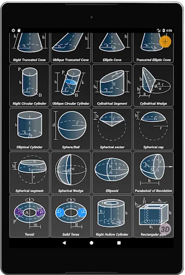 The application calculates an area, perimeter, circumference, diagonal length, volume, coordinates of the geometric centroid, height, side lenght, angle (acute, right, obtuse, straight, reflex), radius (inner, outer), edges, arc length, line segments, base area, lateral surface area and total surface area of three-dimensional geometric shapes.