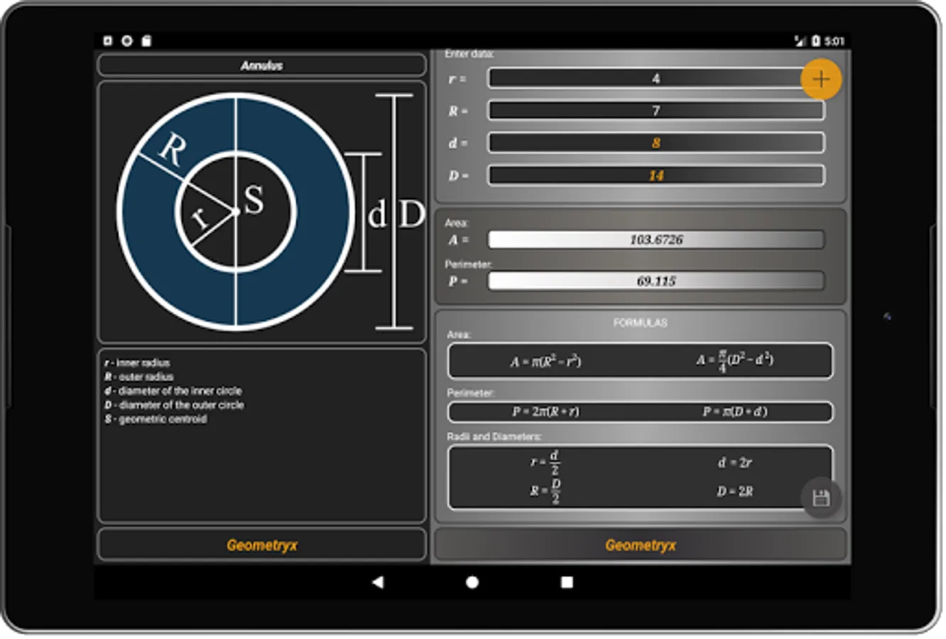 Geometryx also includes the most significant geometric formulas and equations that help you solve any problems and tasks in geometry.